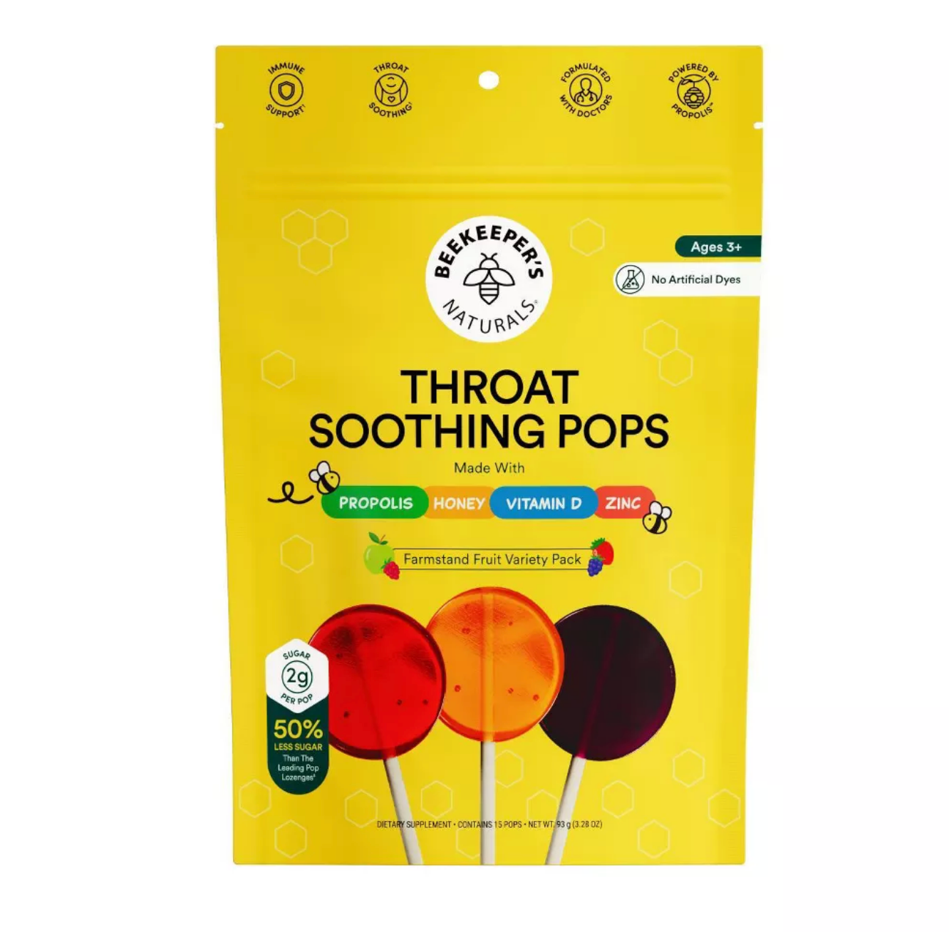 "Our best-selling lozenges, now in a kid-friendly lollipop. Each lollipop is formulated with Propolis Extract, Vitamin D, Zinc, and Wildflower Honey to soothe scratchy throats and support immune systems. They’ll never know it has 50% less sugar than the leading lollipop lozenge. **Each package comes with 15 individually wrapped lollipop lozenges in three delicious flavors - strawberry, mixed berry with elderberry, and green apple.Each package comes with 15 individually wrapped lollipop lozenges in three delicious flavors - strawberry, mixed berry with elderberry, and green apple. Third-party lab tested to ensure our products are pesticide-free. Packaging contains >30% recycled content