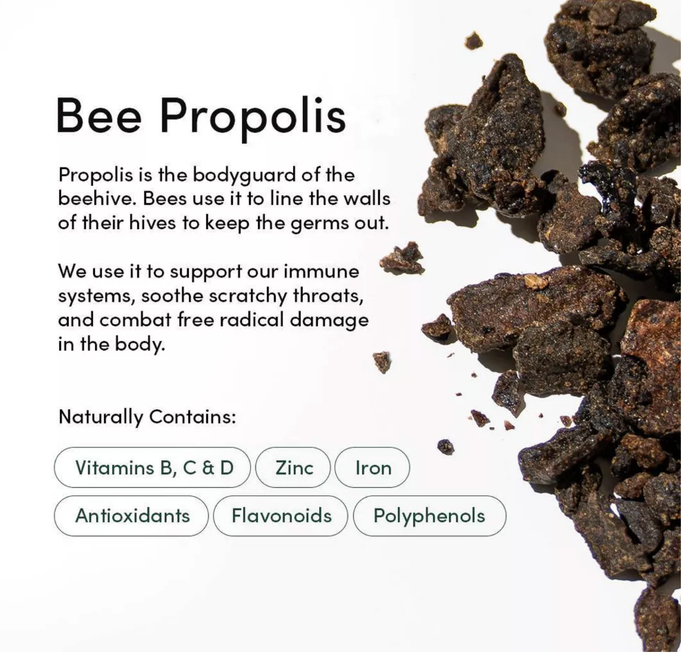 Throat Soothing: Propolis and wildflower honey coat and soothe scratchy, sore throats.