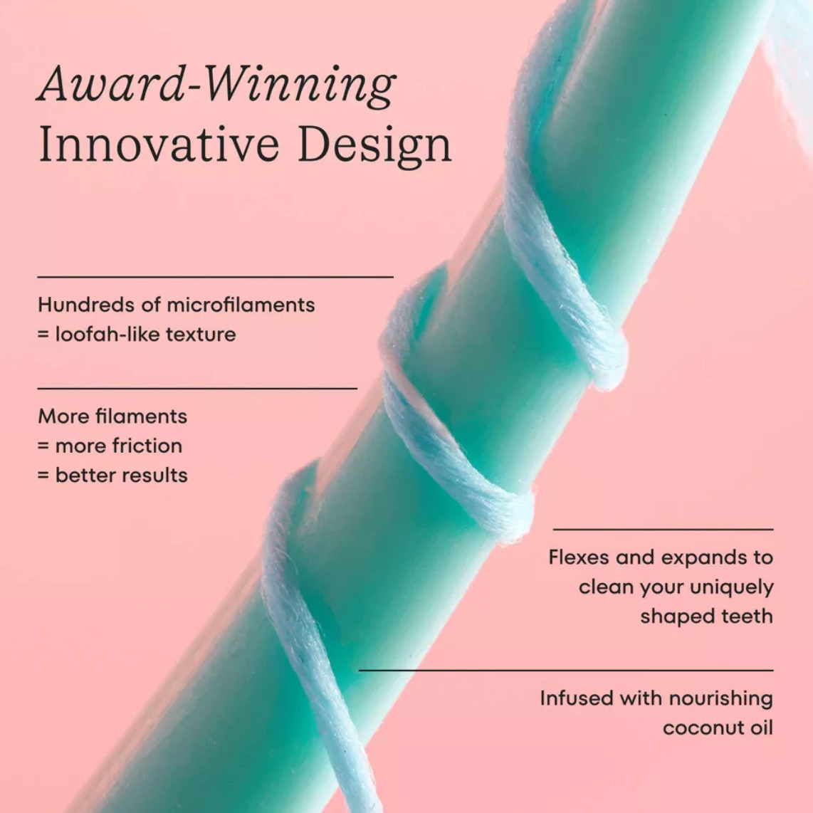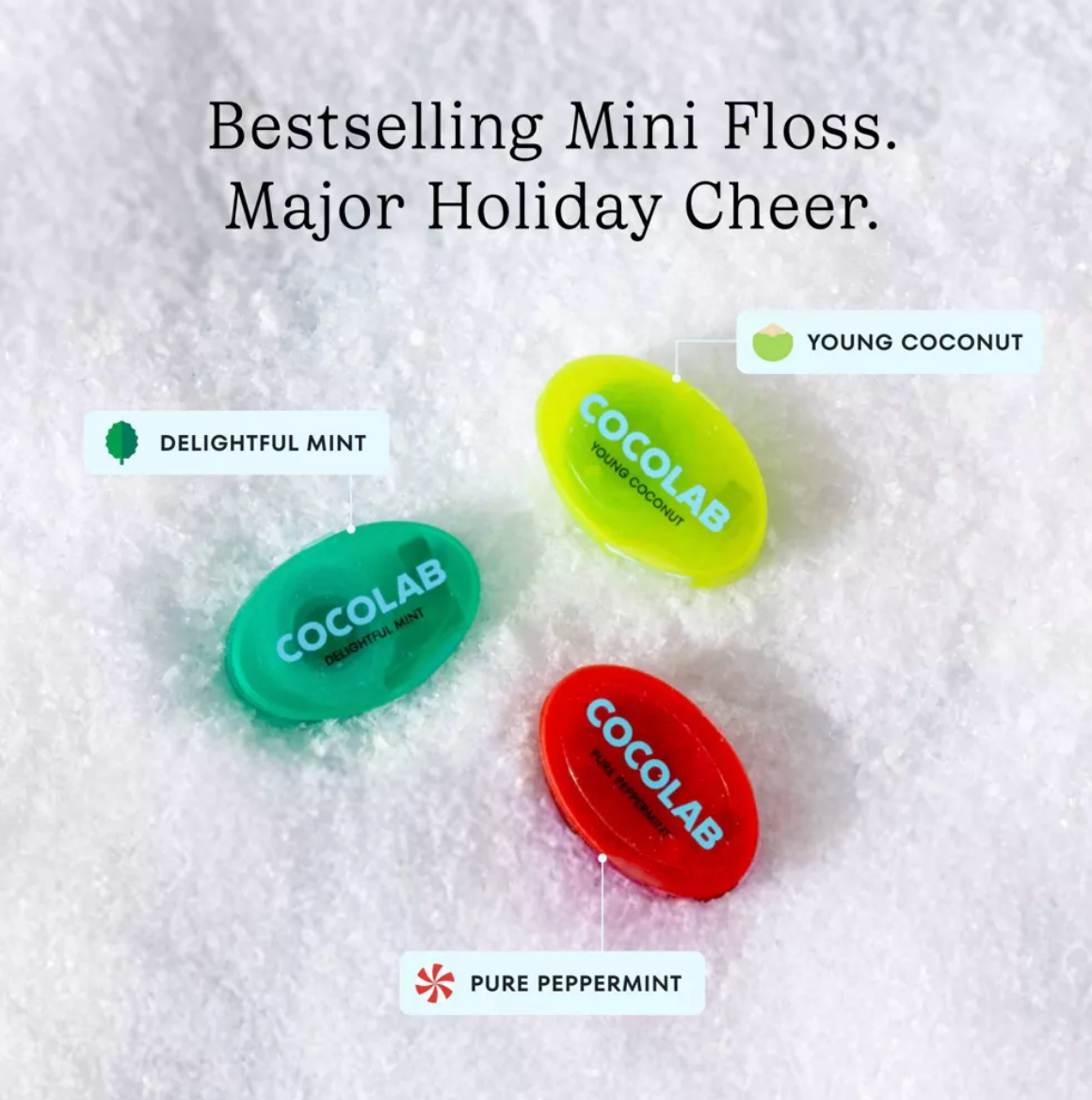 Scrub your smile sparkling clean with the Frosty Floss Trio — three 8-yard minis in crave-worthy holiday flavors. Each spool packs 500+ woven, expandable fibers coated in gum-soothing coconut oil to lift away sticky plaque and leave nothing but minty-fresh confidence behind. Designed by a dentist, loved by smiles everywhere.