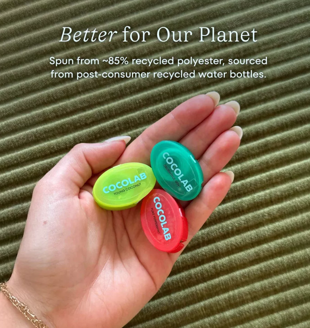 - Product contains recycled content: Cocofloss is woven from ~85% recycled polyester made from post-consumer plastic bottles.