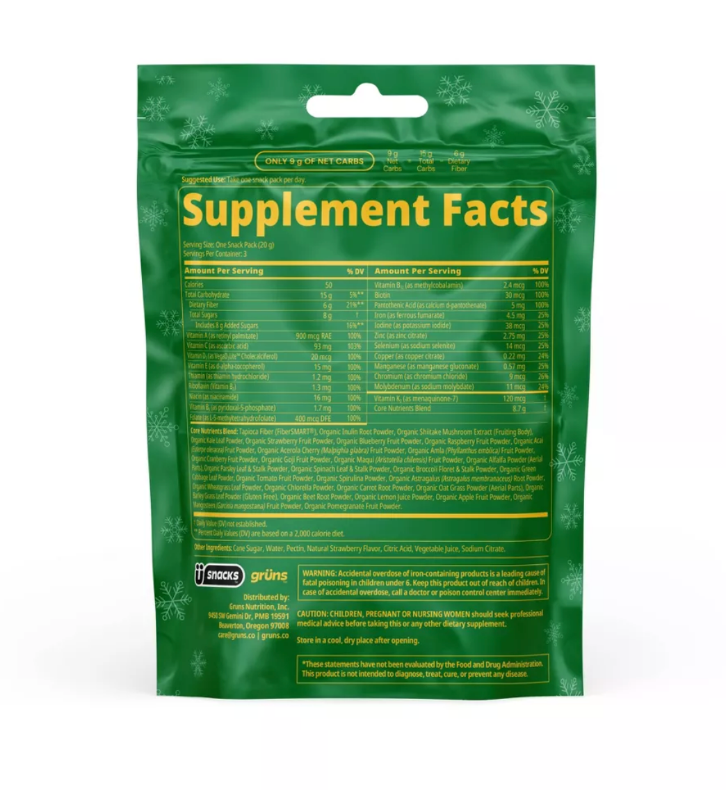 NO MESS, NO STRESS: Convenient and Fun! Each daily pack contains 8 tasty gummy bears so there’s no more cobbling together handfuls of supplements. Grüns is thoughtfully formulated to be a delicious and seamless addition to your daily routine with our individual snack packs.