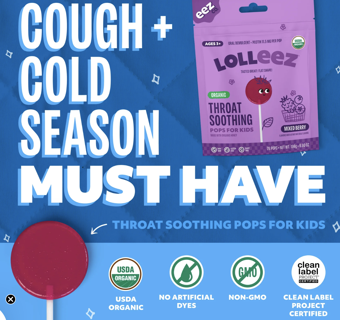 These USDA Certified Organic, kid-friendly lollipops are crafted in a fun, flat lollipop/sucker format that kids love, while still delivering effective relief for sore, irritated throats. Founded by parents who believe in clean ingredients, Lolleez combines trusted organic ingredients with parent-approved peace of mind. We make feeling better EEZY.