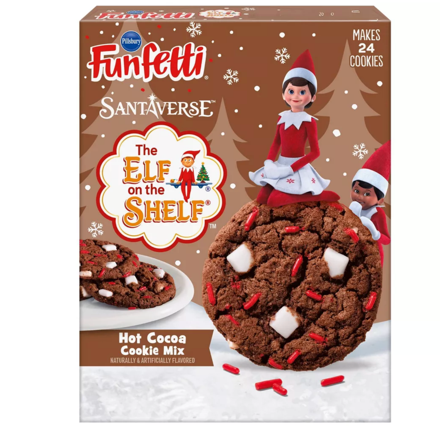 It's the season of hot cocoa, and Pillsbury Funfetti The Elf on the Shelf Hot Cocoa Cookie Mix certainly makes the Nice List. Channeling the flavors of the iconic winter drink, our mix includes the cocoa taste you love, sprinkles and marshmallow candy bits. Easy to make, our festive cookies only require two ingredients and bake in less than 15 minutes. That means you'll get your cookies before you know it. Plus, make this season special with cutouts on the back of the box. A box of our cookie mix makes 24 cookies and a lot of smiles.