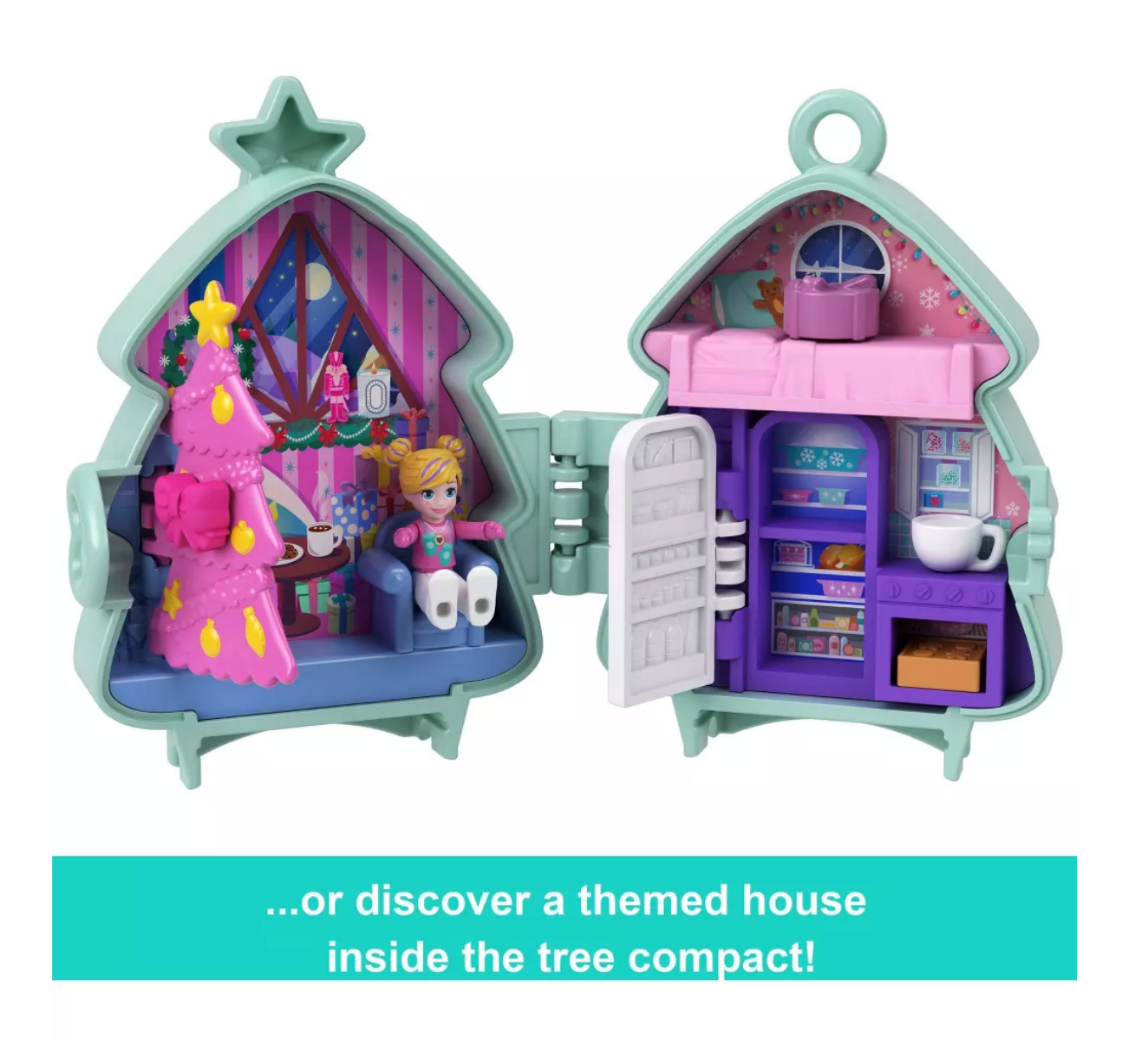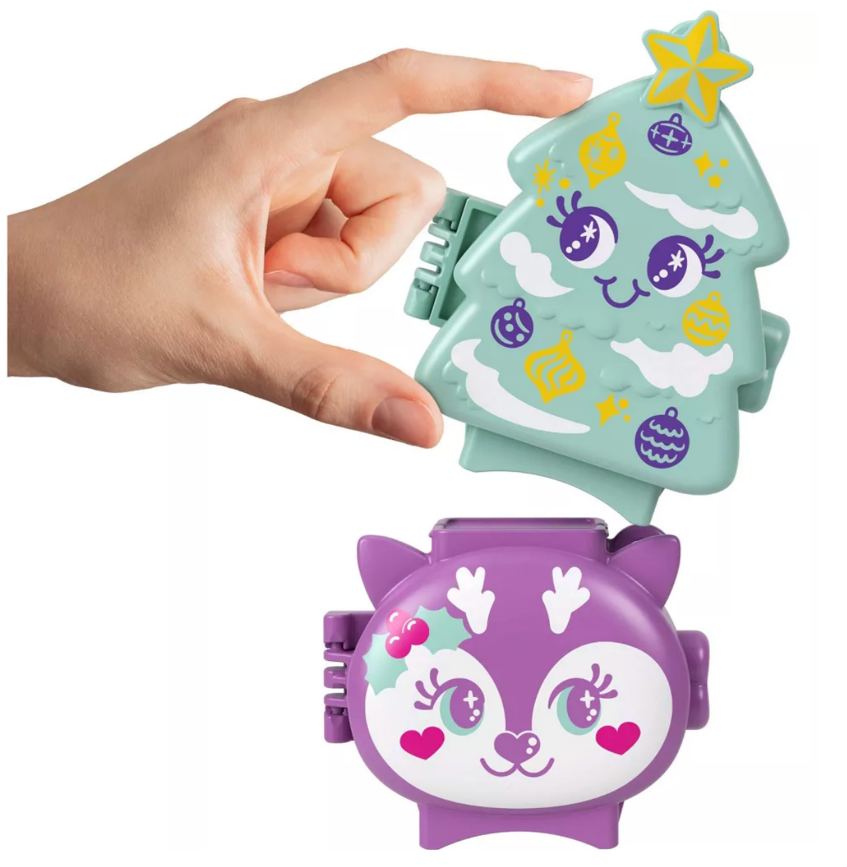 An adorable reindeer and Christmas tree decorate the outside of these Polly Pocket Holiday Connects compacts that open to reveal tiny worlds filled with big adventures!