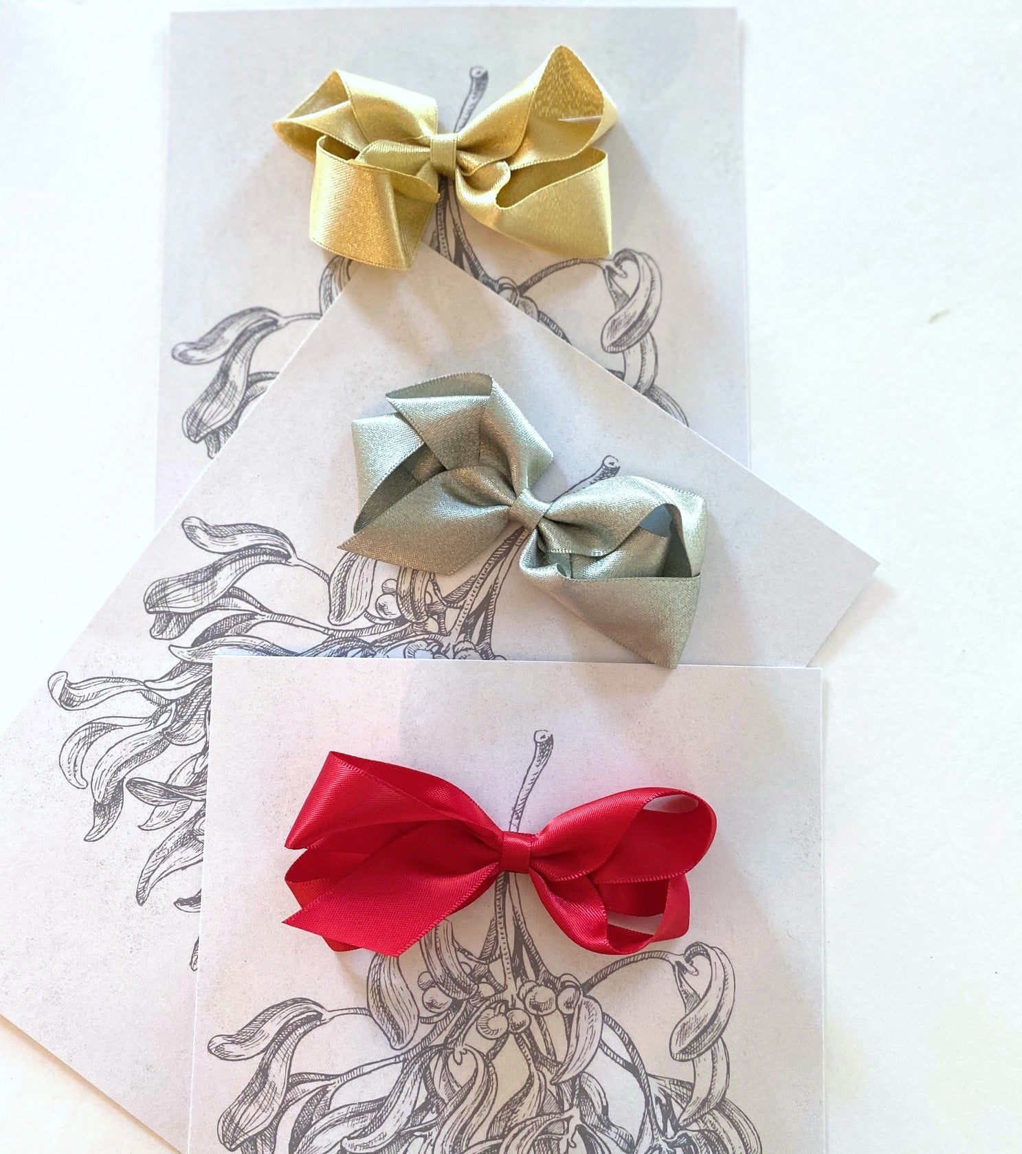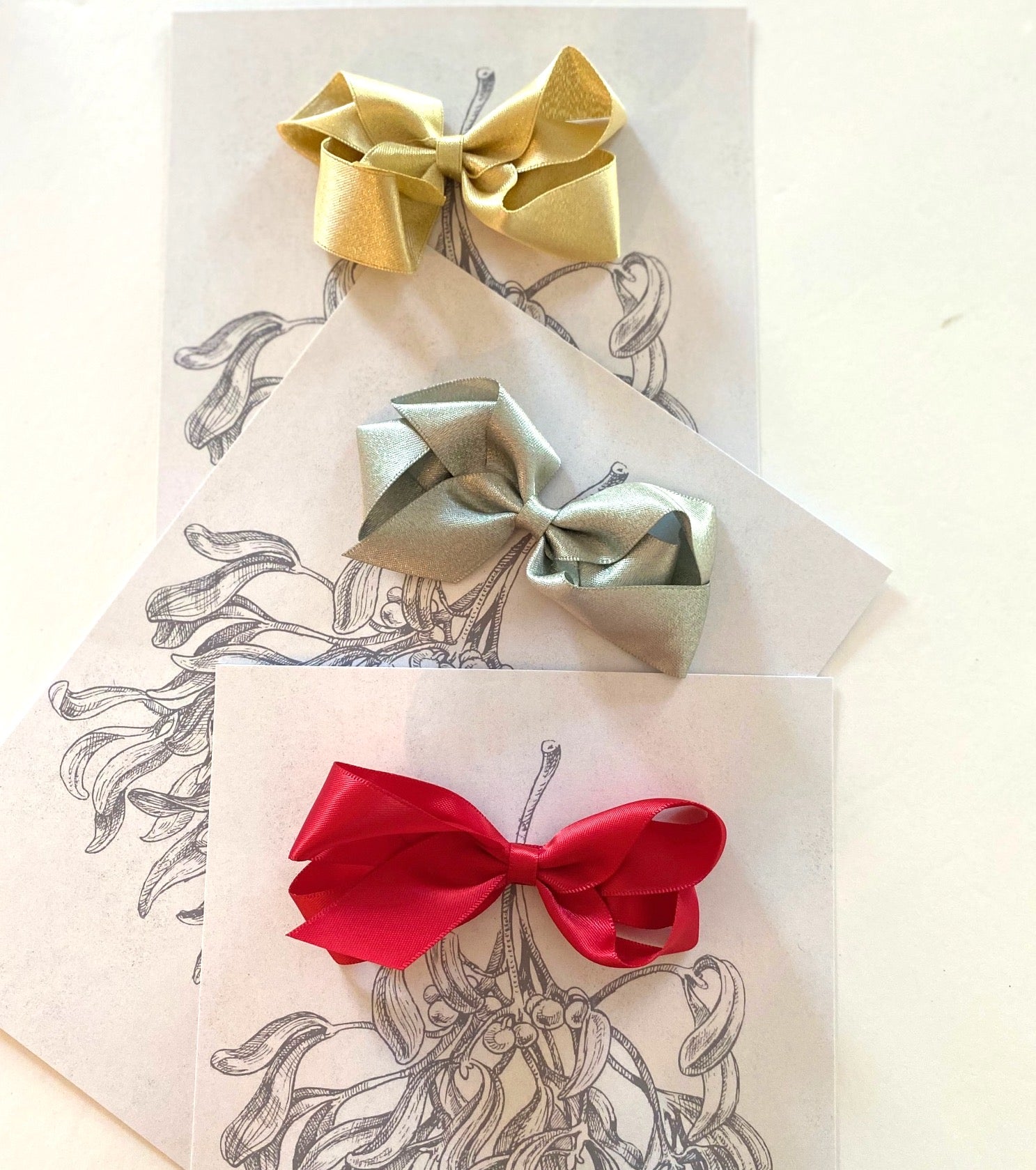 Our gift card comes with a medium satin clip attached in gold in a clear bag. Card measures 148 x 210.