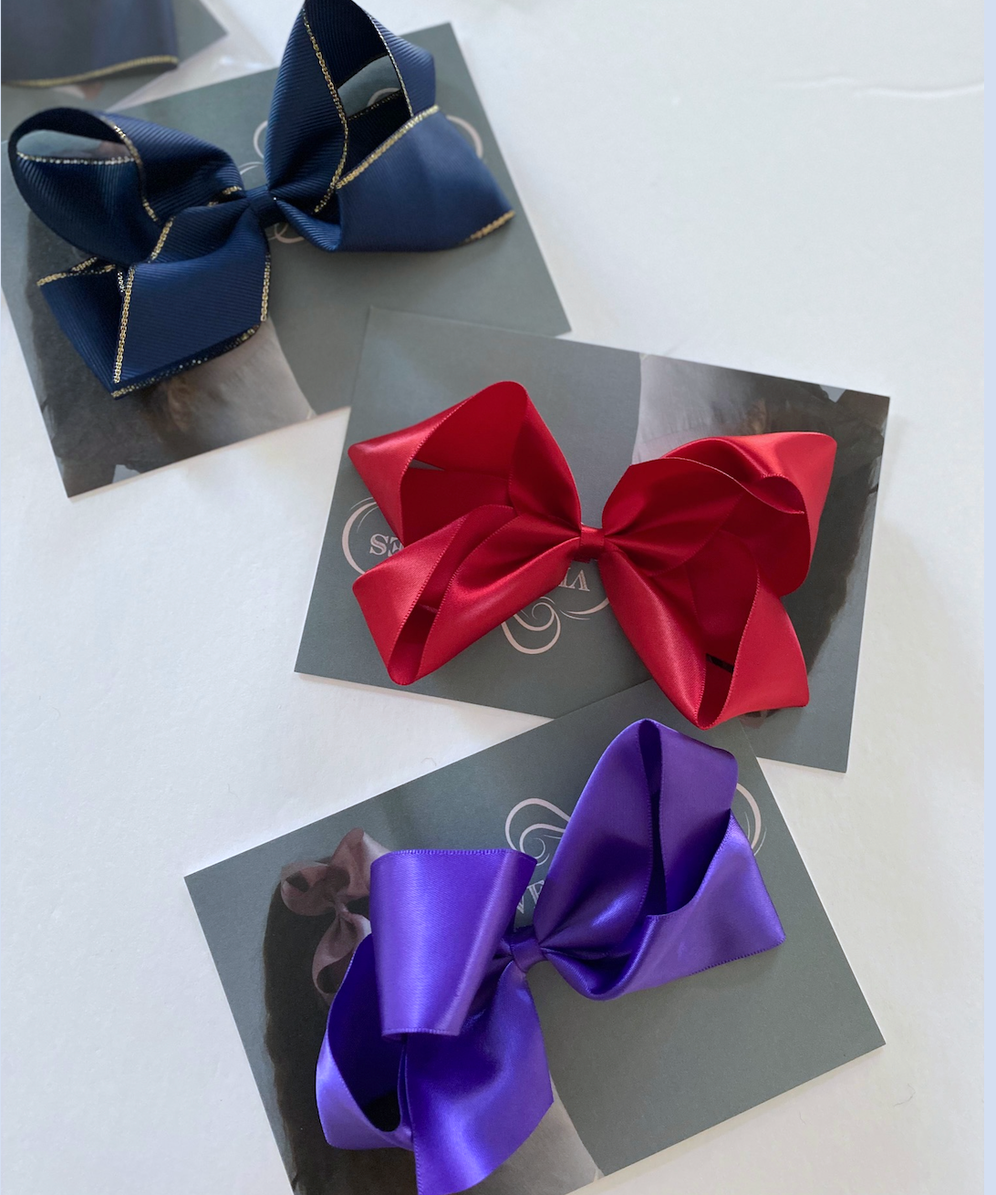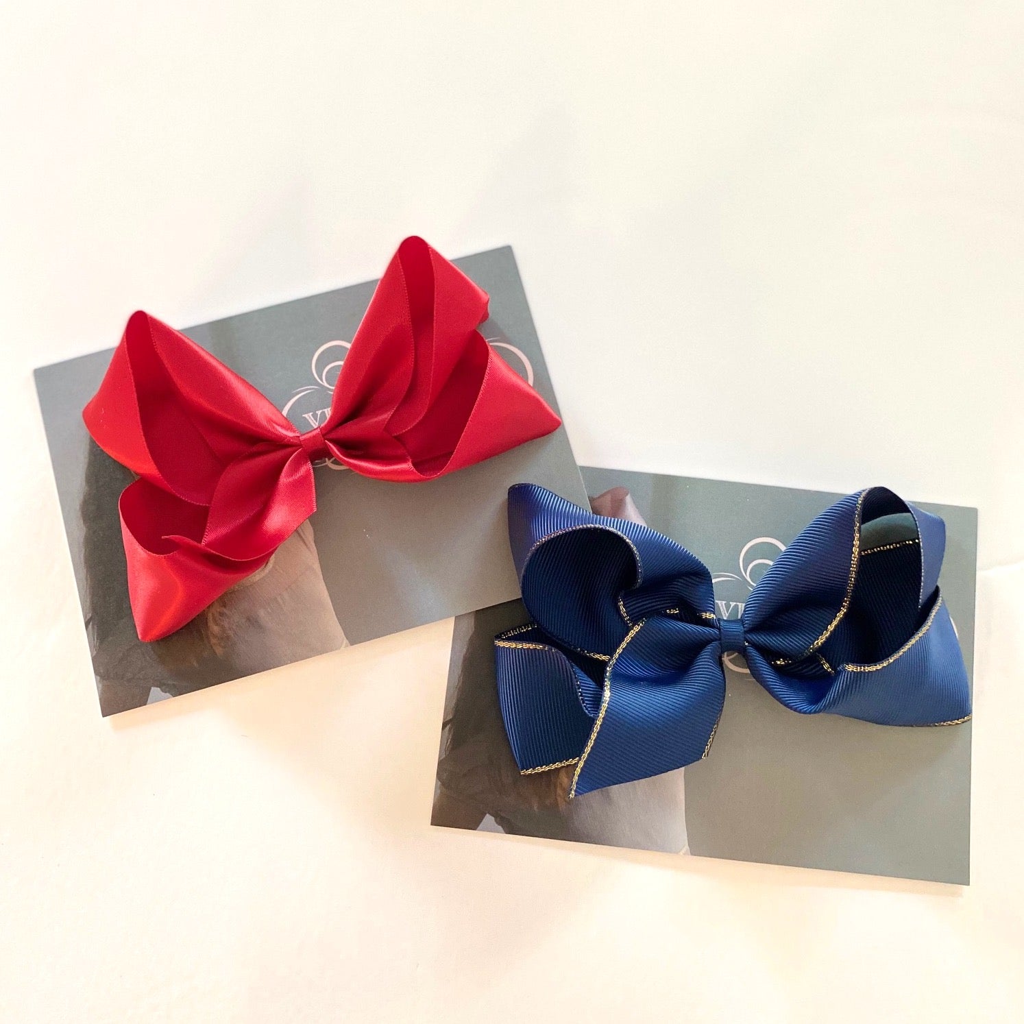 Large grosgrain bow with a gold edge on a hair clip. Bow measures approximately 11.5cm by 7.5cm