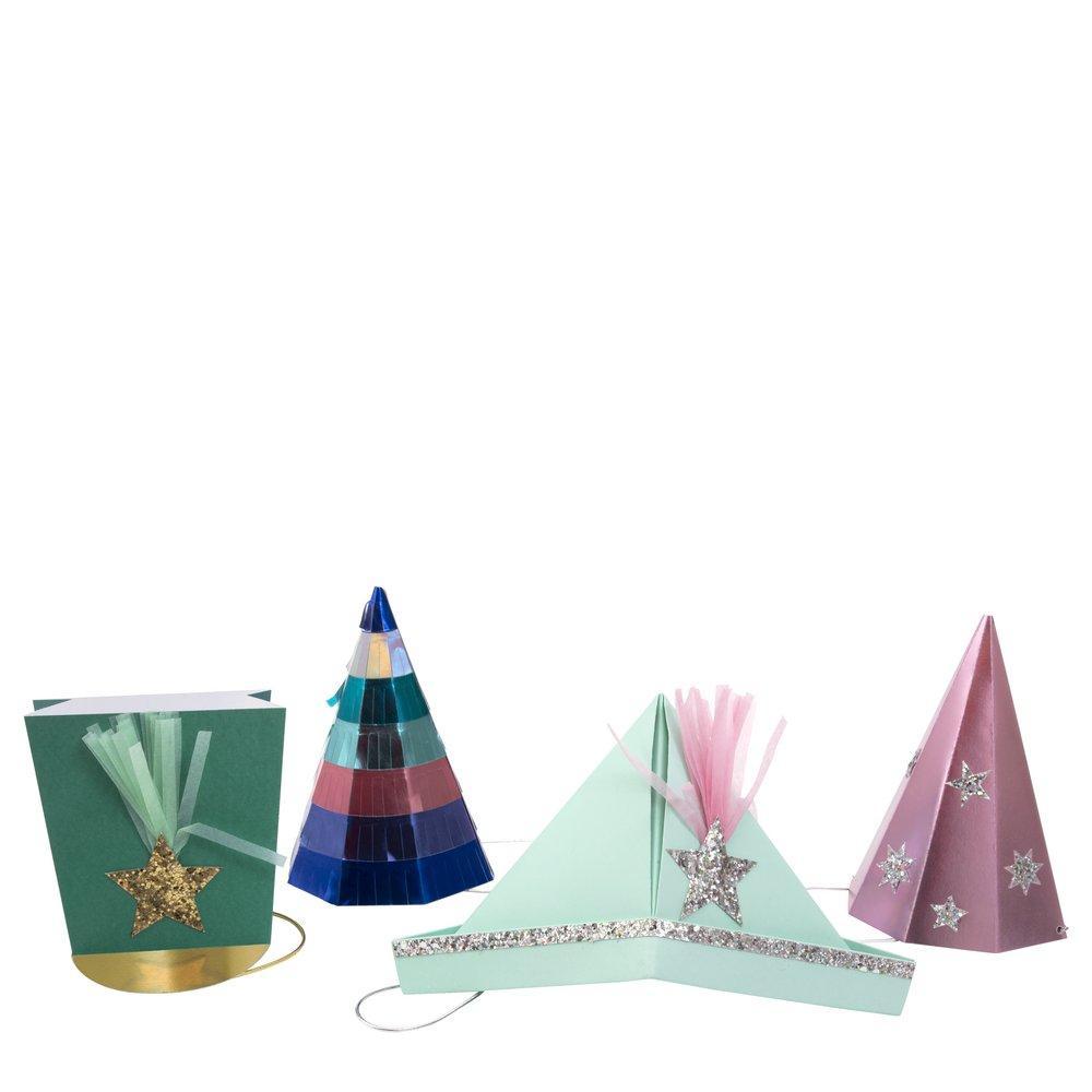 Why offer guests plain party hats when they can wear these amazing creations? Featuring four colorful designs with shimmer, shine and tassels to make everyone look festive fantastic!