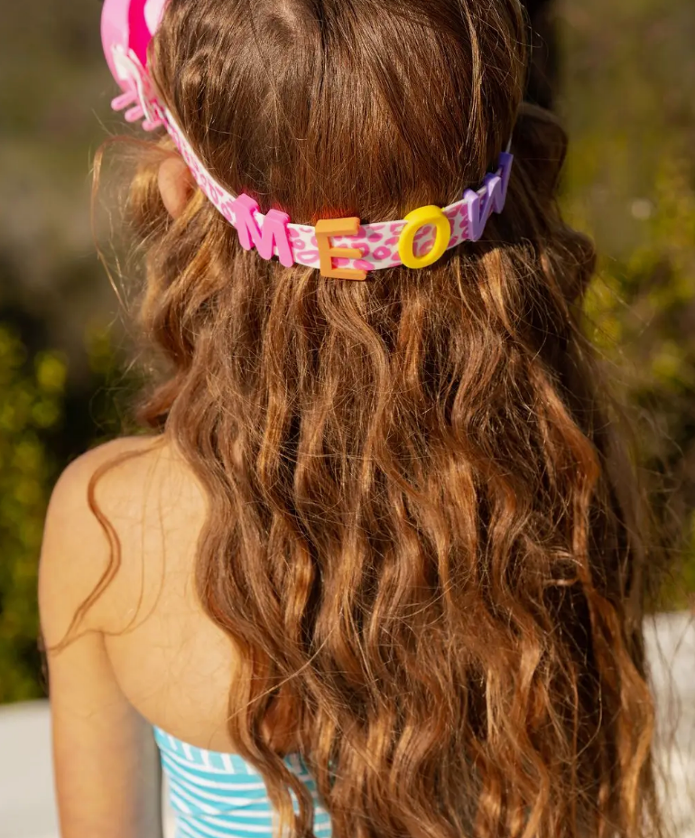 Leopard print with sliders that spell MEOW on the back. Fits ages 6 and up.