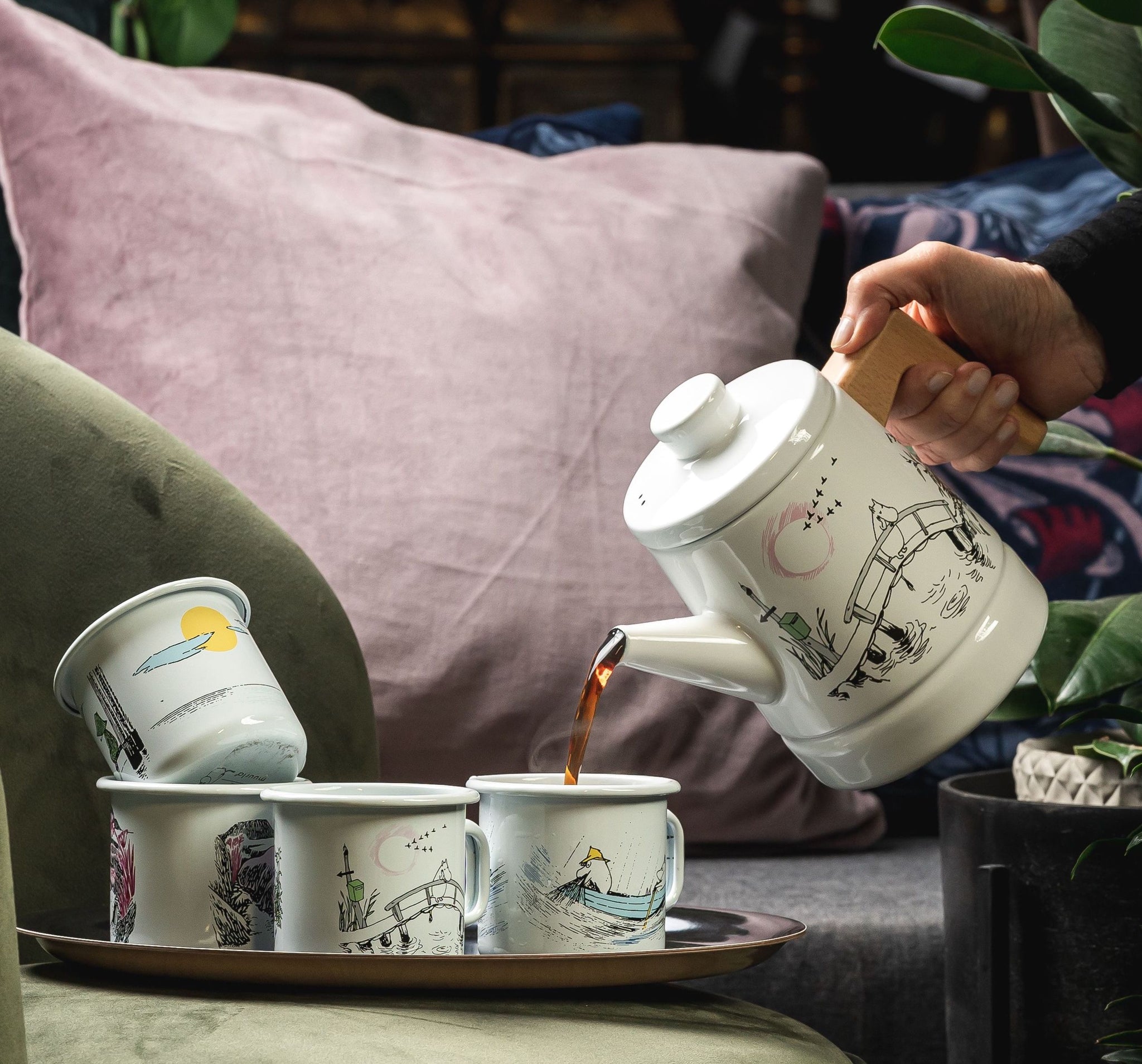 The Moomin Originals enamel coffee pot carries a nostalgic design. It is suitable for boiling water, preparing coffee in a traditional method, or serving. The enamel coffee pot is made of a carbon steel core and carries a double coating of enamel. The handle is made of wood. Both parts are handmade. The dark blue inner colour is hot water resistant and prevents stains from emerging. Suitable for all hobs. All of our enamel items are handmade. Appearance may vary due to the nature of handicrafts. Enamel is a durable material, but its surface may chip if subjected to a hard hit. Please handle your enamel item with care.