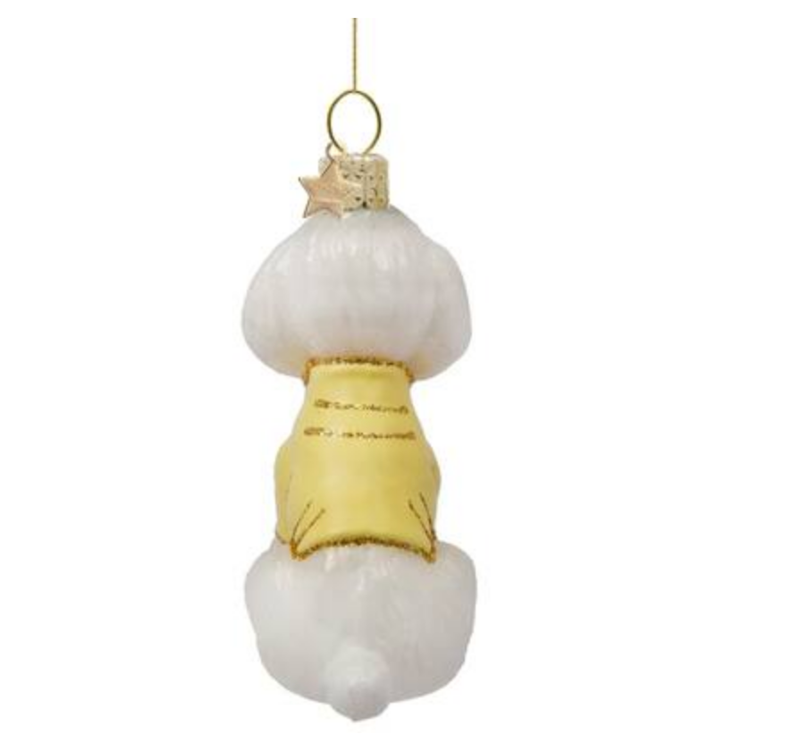 Ornament glass white poodle w/yellow t-shirt H8cm