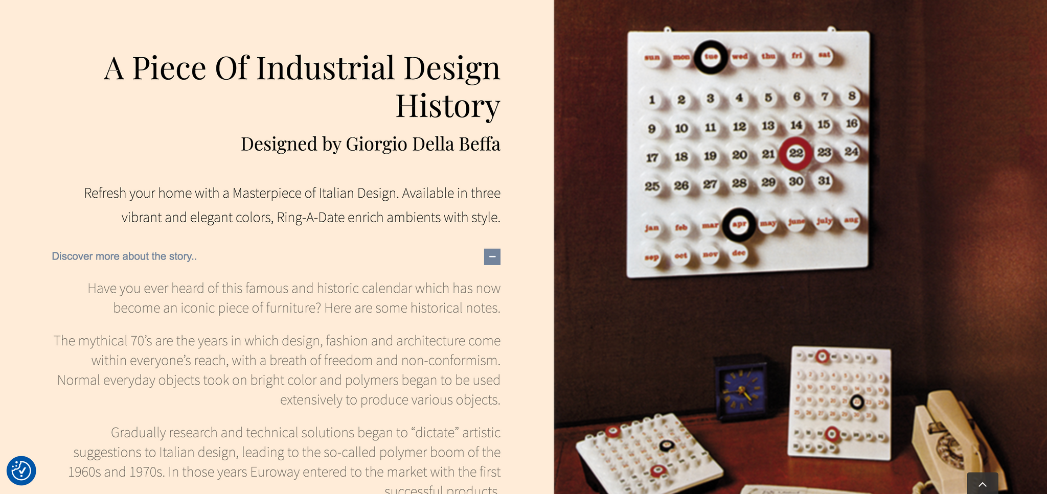 Refresh your home with a Masterpiece of Italian Design. Available in three vibrant and elegant colors, Ring-A-Date enrich ambients with style.