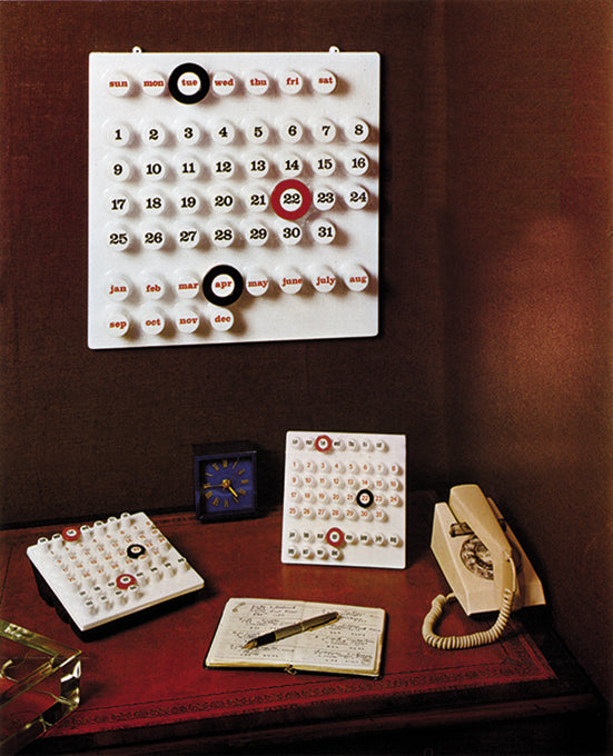 Designed by Giorgio Della Beffa in 1970, the “Ring a Date Perpetual Calendar” was immediately appreciated by the public all over the world, crowning its success with an exhibition of several years at the “Museum of Modern Art” in New York (MoMA ). Subsequently, given the great success, as you can see in these photos of the time, the table versions and one of intermediate size were manufactured.