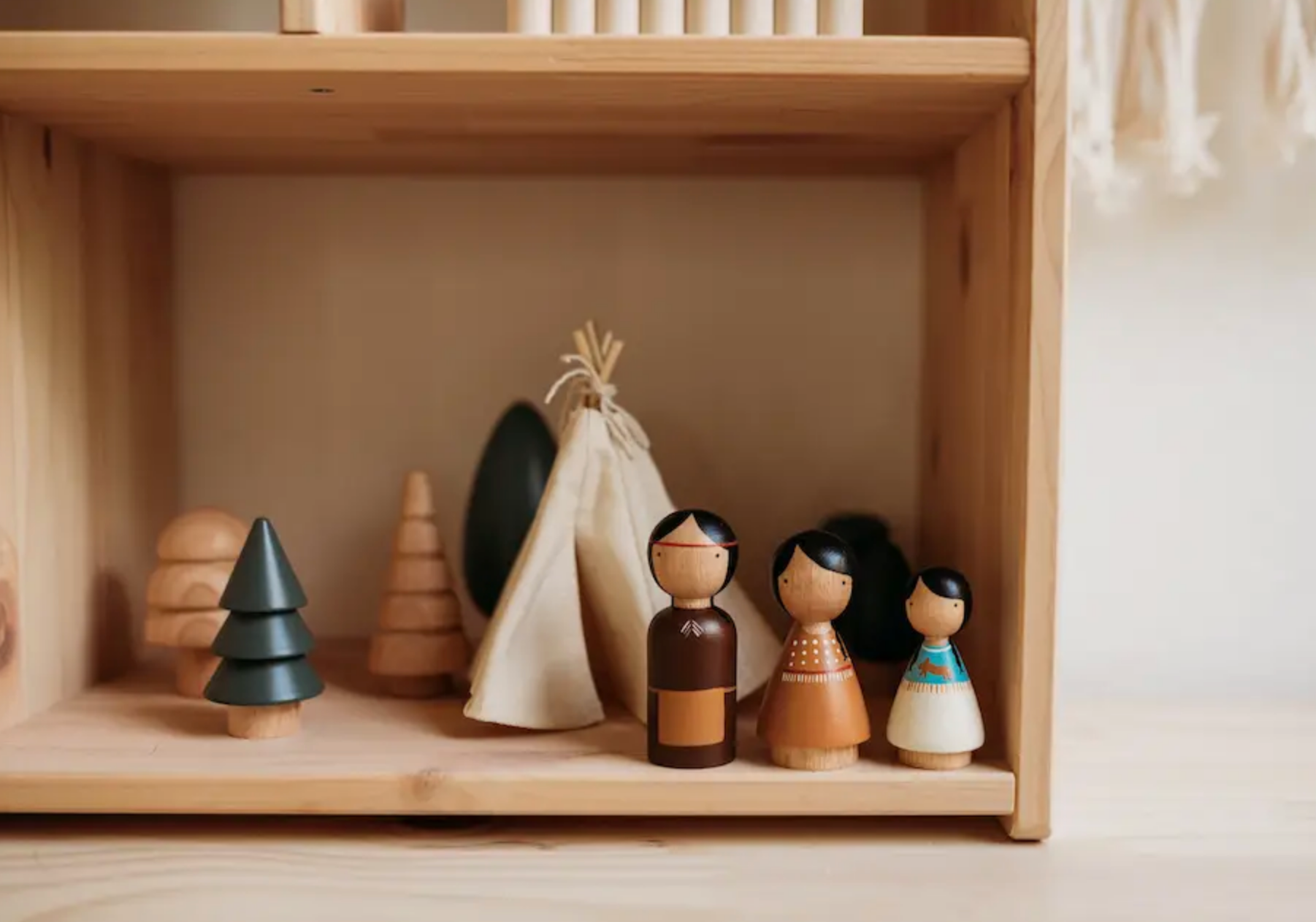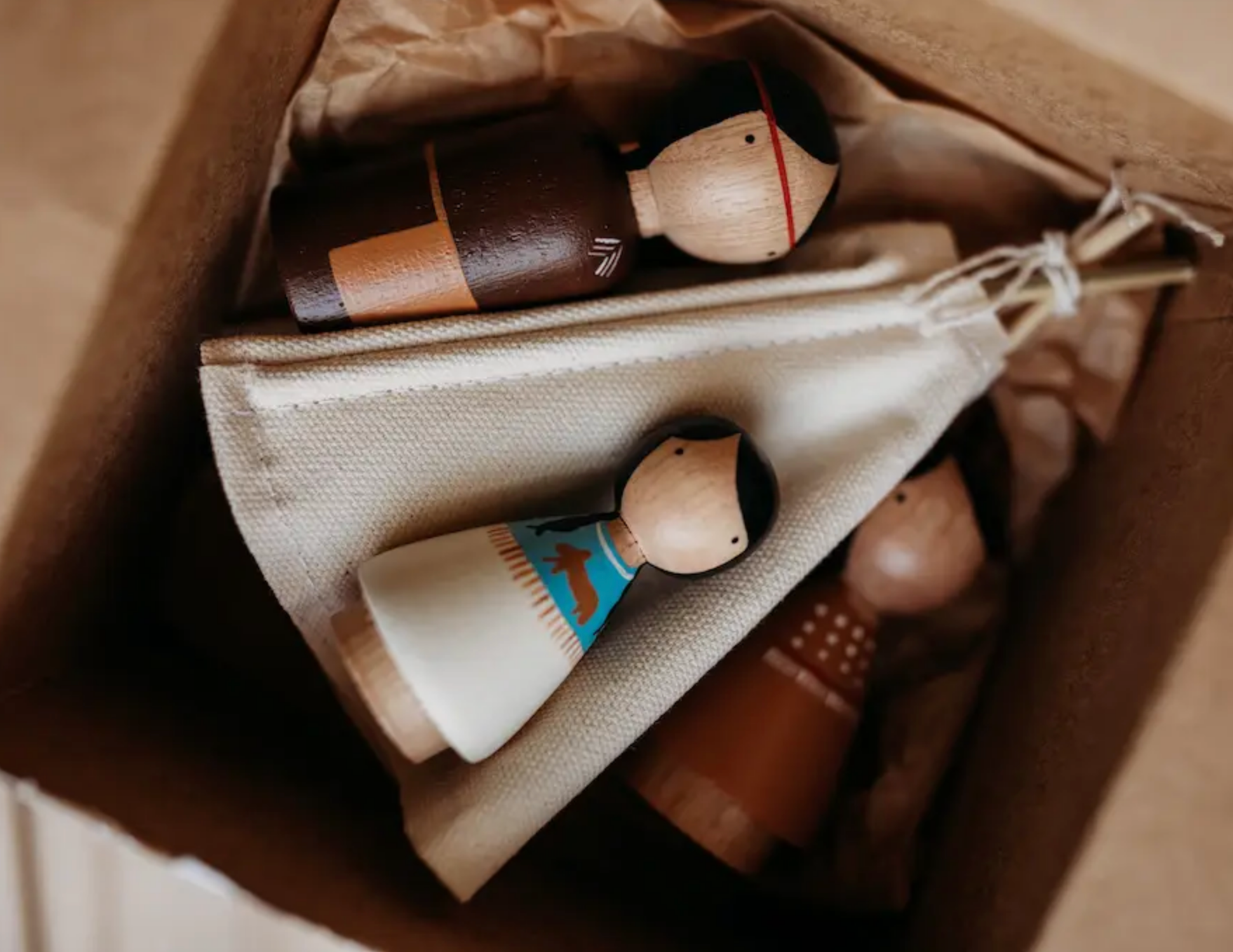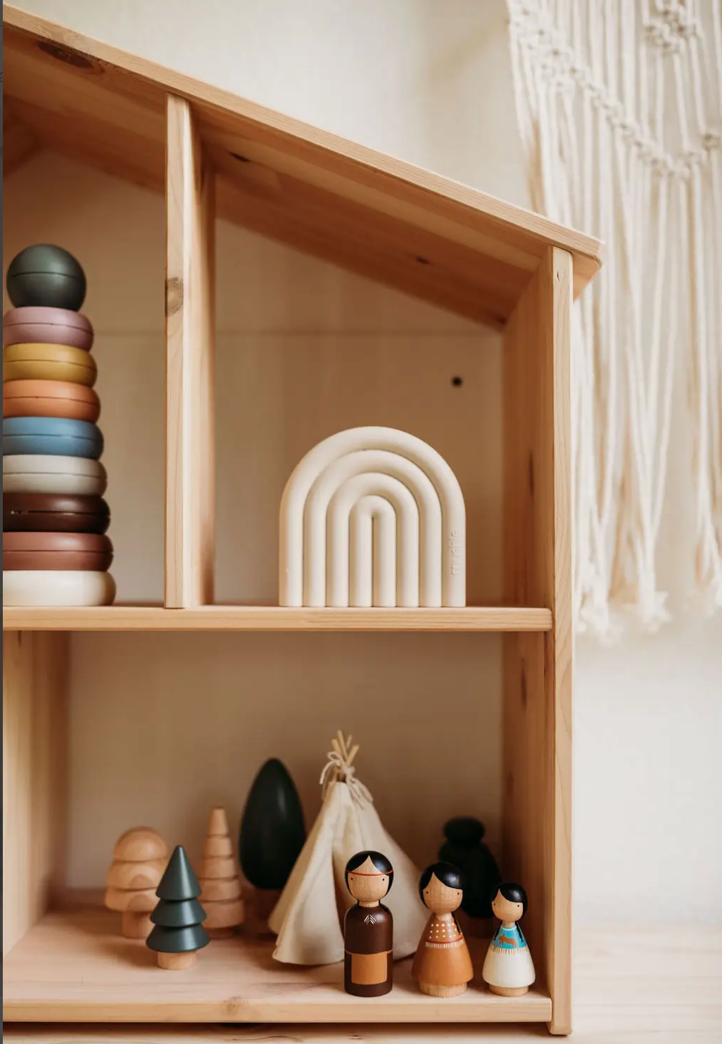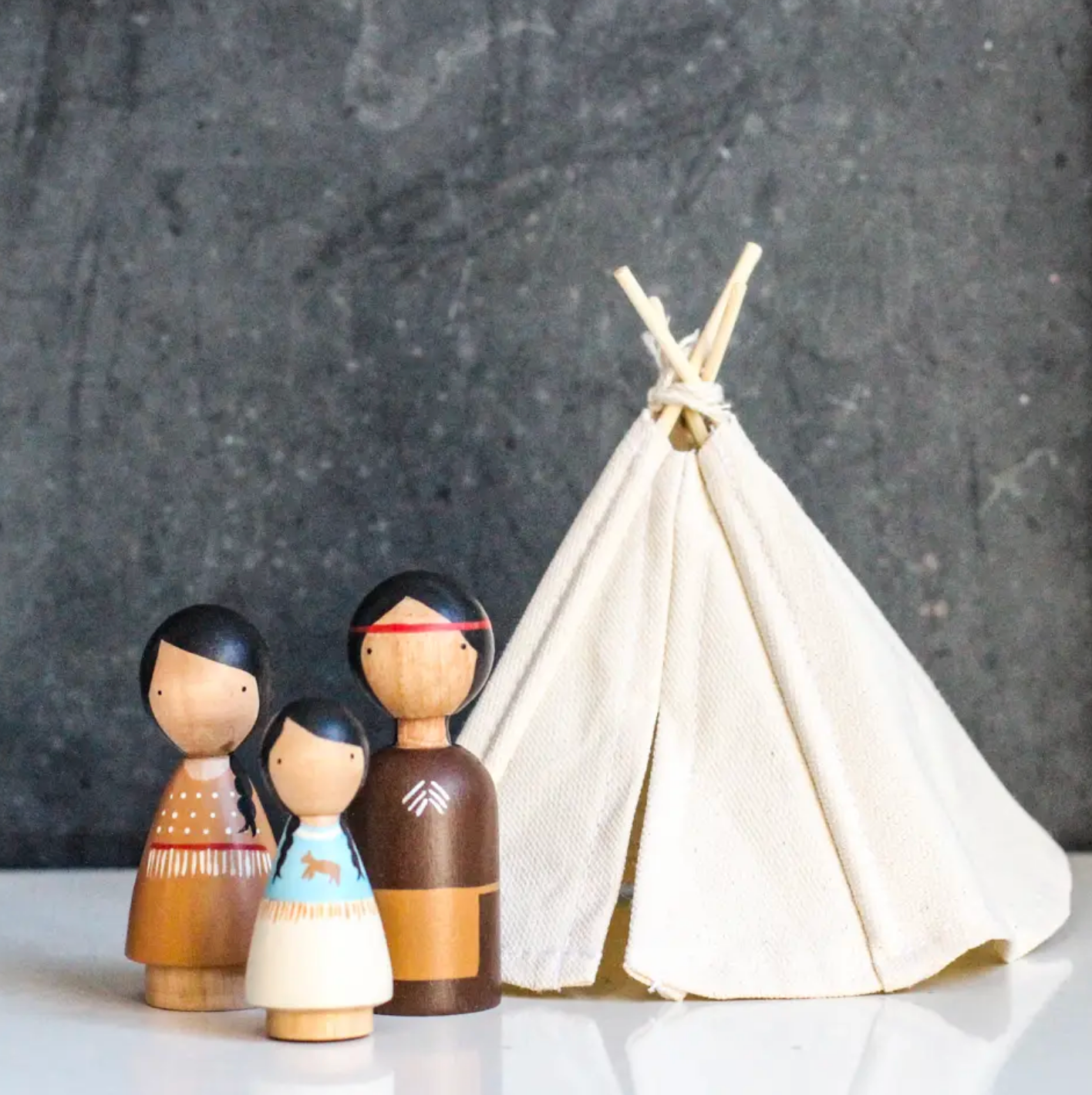 INCLUDES One Dollhouse Teepee, just under 6inches/15cm high + dolls. This is a small teepee, great for delicate play. This is a package deal that comes with 3 dolls! The parent dolls in the photo are 3" tall and the child doll is 2.5" tall. *The teepee comes packaged flat and made need a little fluffing up upon arrival ;) // 9 cm. and 6.5 cm.