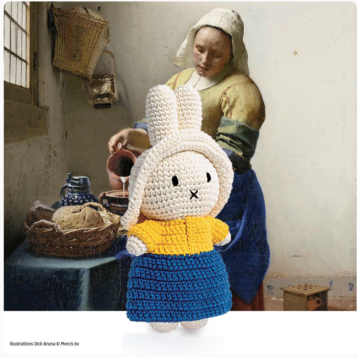 Miffy handmade is wearing an outfit inspired by The Milkmaid of Johannes Vermeer, allowing children to discover the story behind this painting.