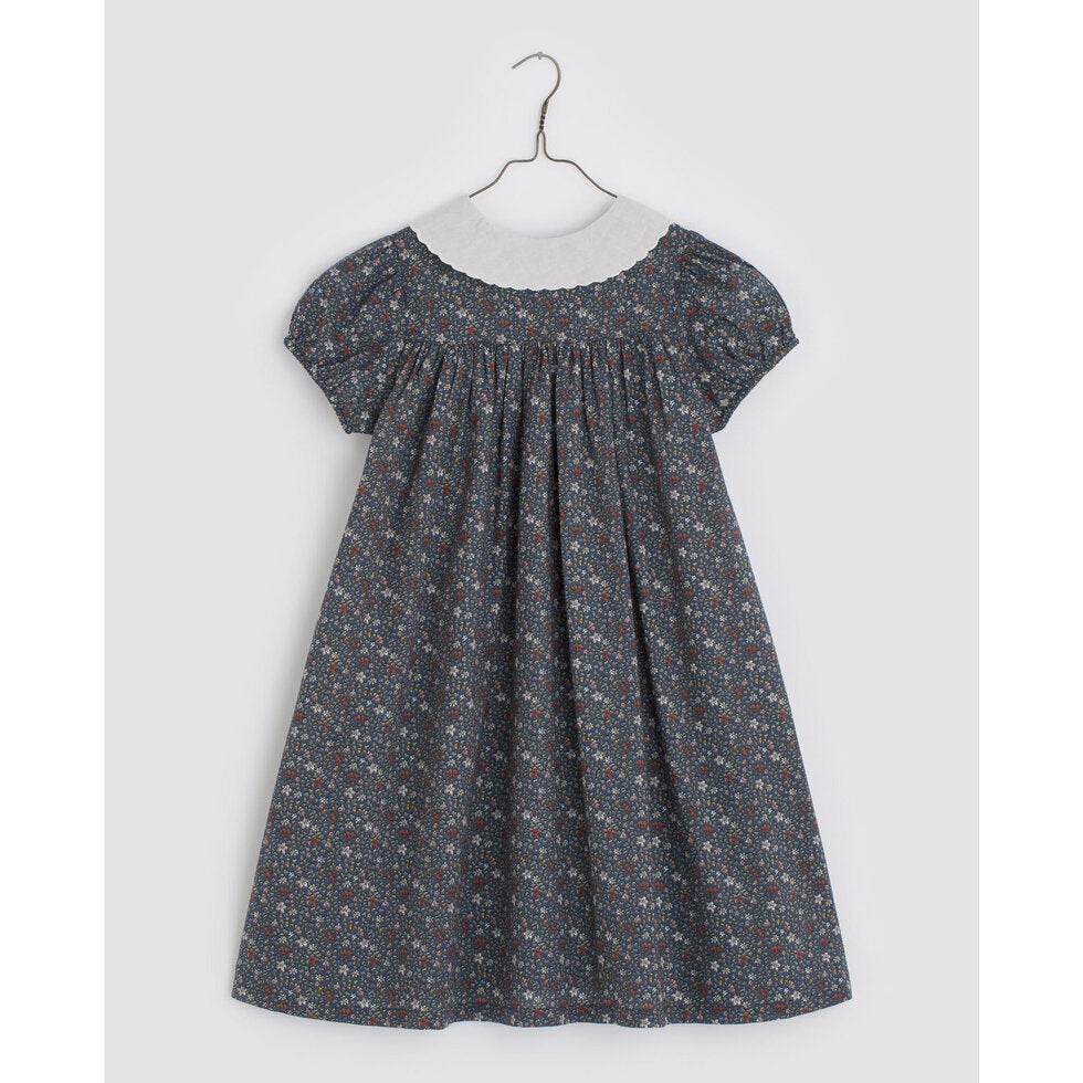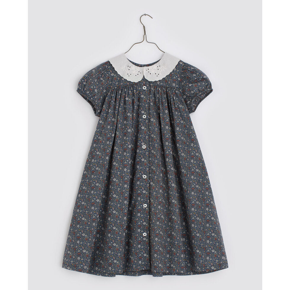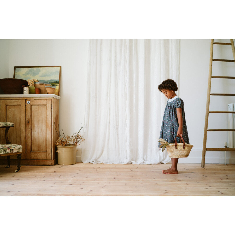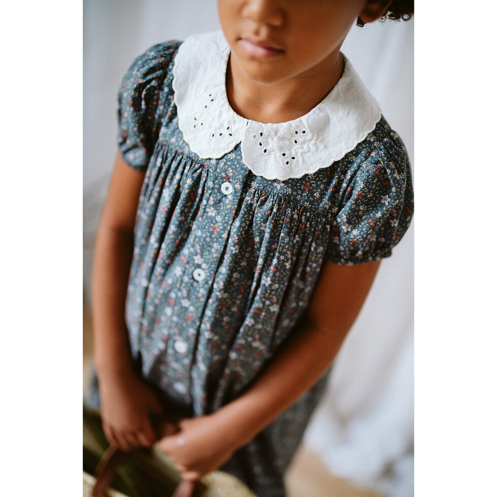 A gorgeously simple little Summer dress in printed cotton poplin.  Button front, elasticated puff sleeves and a delicate lace collar.  It’s comfortable enough for every day, but special enough for an occasion.