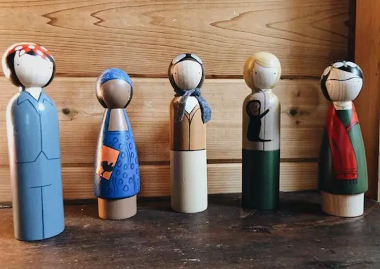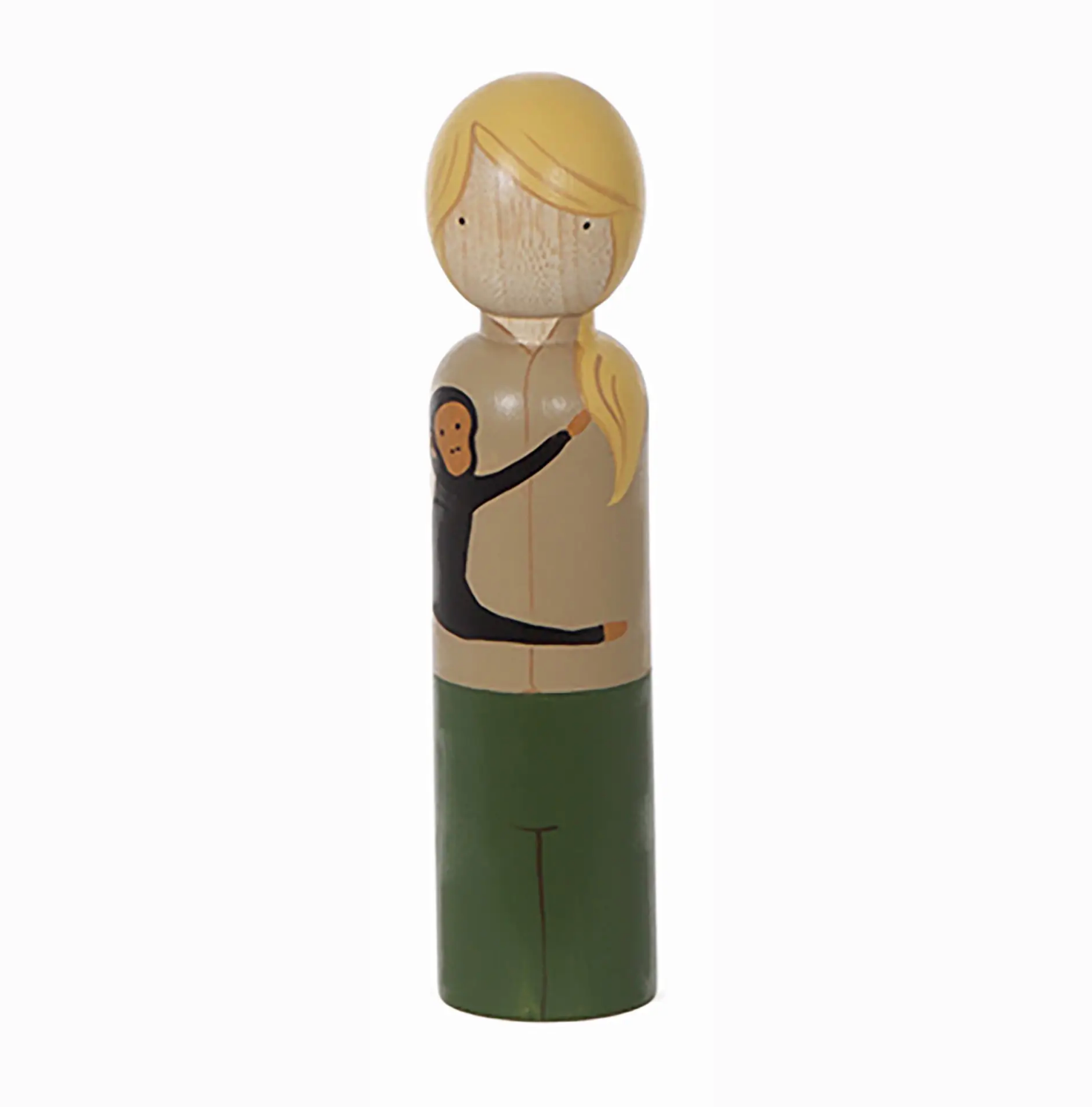 1 collectible doll, size 7.5", made in the artistic representation of Jane Goodall. This doll is double the size and weight of our regular line. She is sold individually and comes packaged in her own box. Hand-chiseled from Urapán wood on an electric lathe, these classic wooden peg dolls are finished with USA-made non-toxic water-based paints. Each doll is unique and safe for little hands. We design our dolls in our Brooklyn studio and work with artisans in Bogotá, Colombia to help us reproduce our designs. Our carpenter uses sustainably-harvested trees; when one tree is used, two are planted. Our team includes Goose Grease-trained craftsmen and craftswomen, from Bogotá to Brooklyn, and each doll is carefully hand-drawn and hand-painted from start to finish.