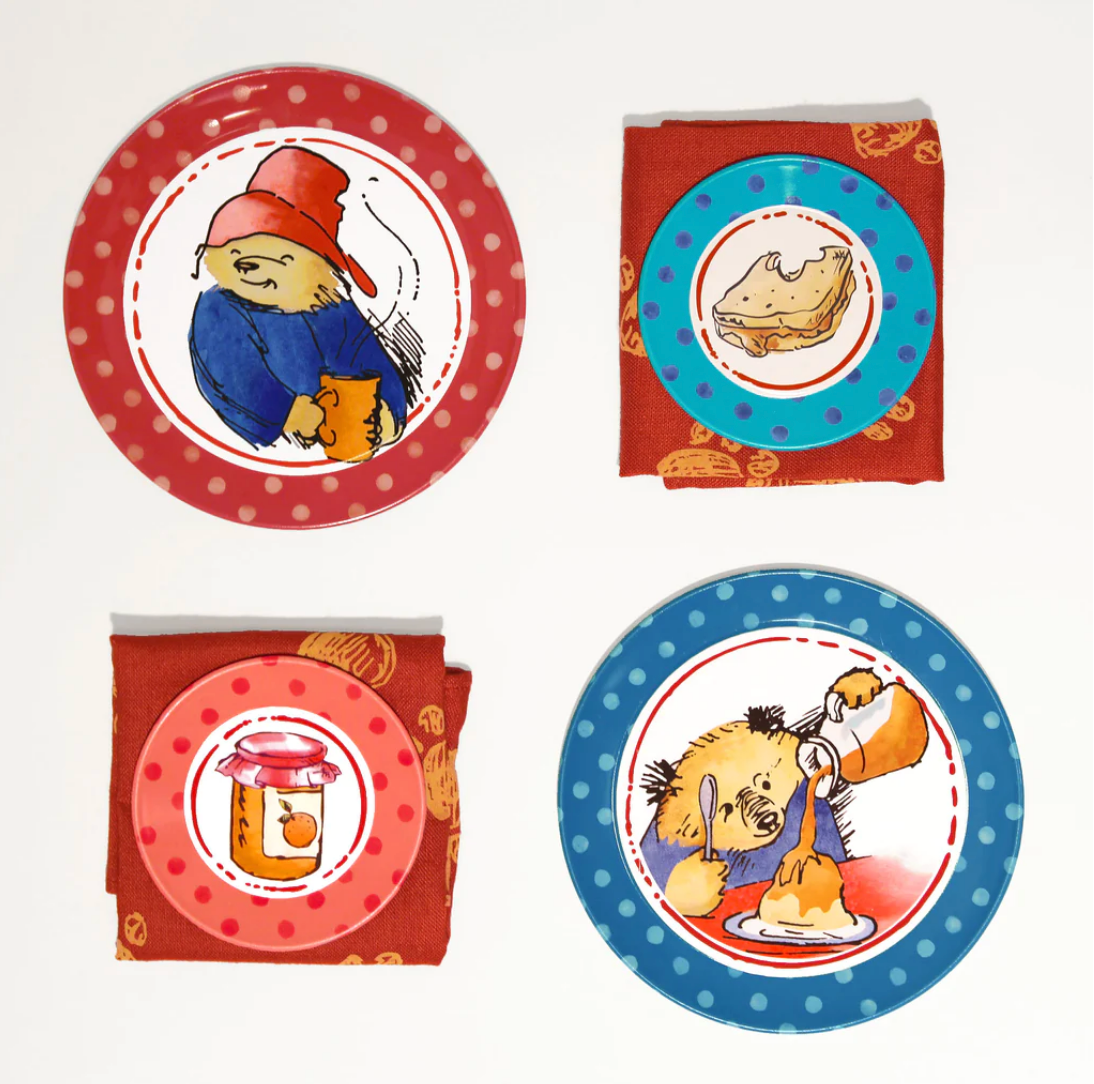 Paddington 14-Piece Tin Tea Set has all the essentials to create impromptu tea parties. Set includes tea pot with lid, serving tray, 2 cups, 2 saucers, 2 plates, 2 spoons, and 2 napkins which all fit nicely in a sturdy printed suitcase printed with travel stamps of Paddington's adventuress. Decorated with illustrations from the original Paddington books, this deluxe tea set is designed for paw-fectly delightful tea times.