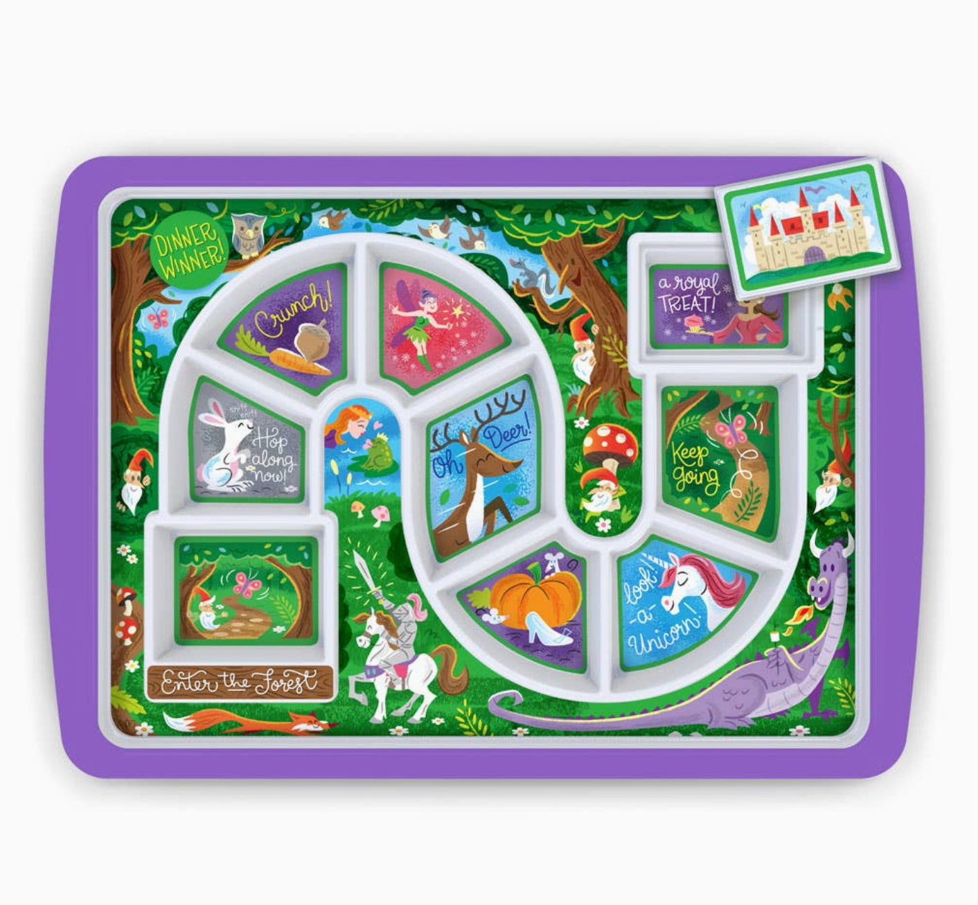 Take a culinary tour through an Enchanted Forest! DINNER WINNER provides eat-as-you-go action that culminates in a hidden “surprise.” Molded from BPA-free, 100% virgin melamine, it’s food-safe and dishwasher-safe.