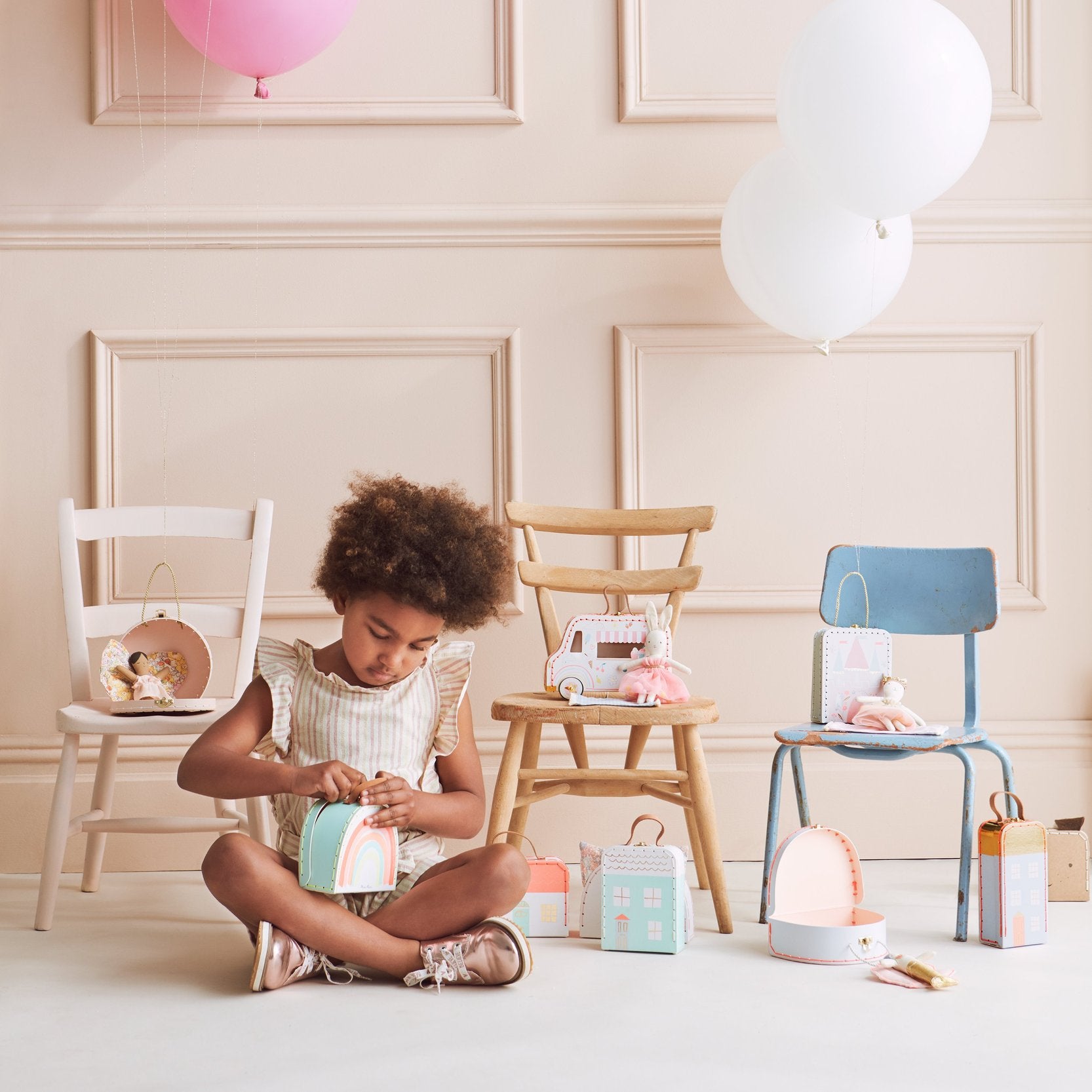 • The suitcase is crafted from laminated stitched card, and has delightful illustrations and gold foil detail