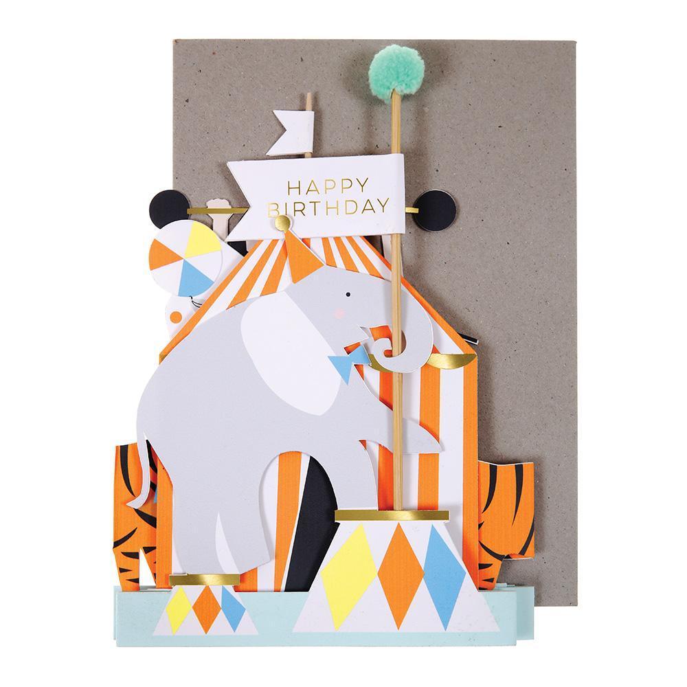 This delightful concertina card unfolds to reveal a circus big top with animals, strongman and magician. It is embellished with gold foil and has a funky flagpole with a Happy Birthday flag. Comes with a coordinating textured envelope.