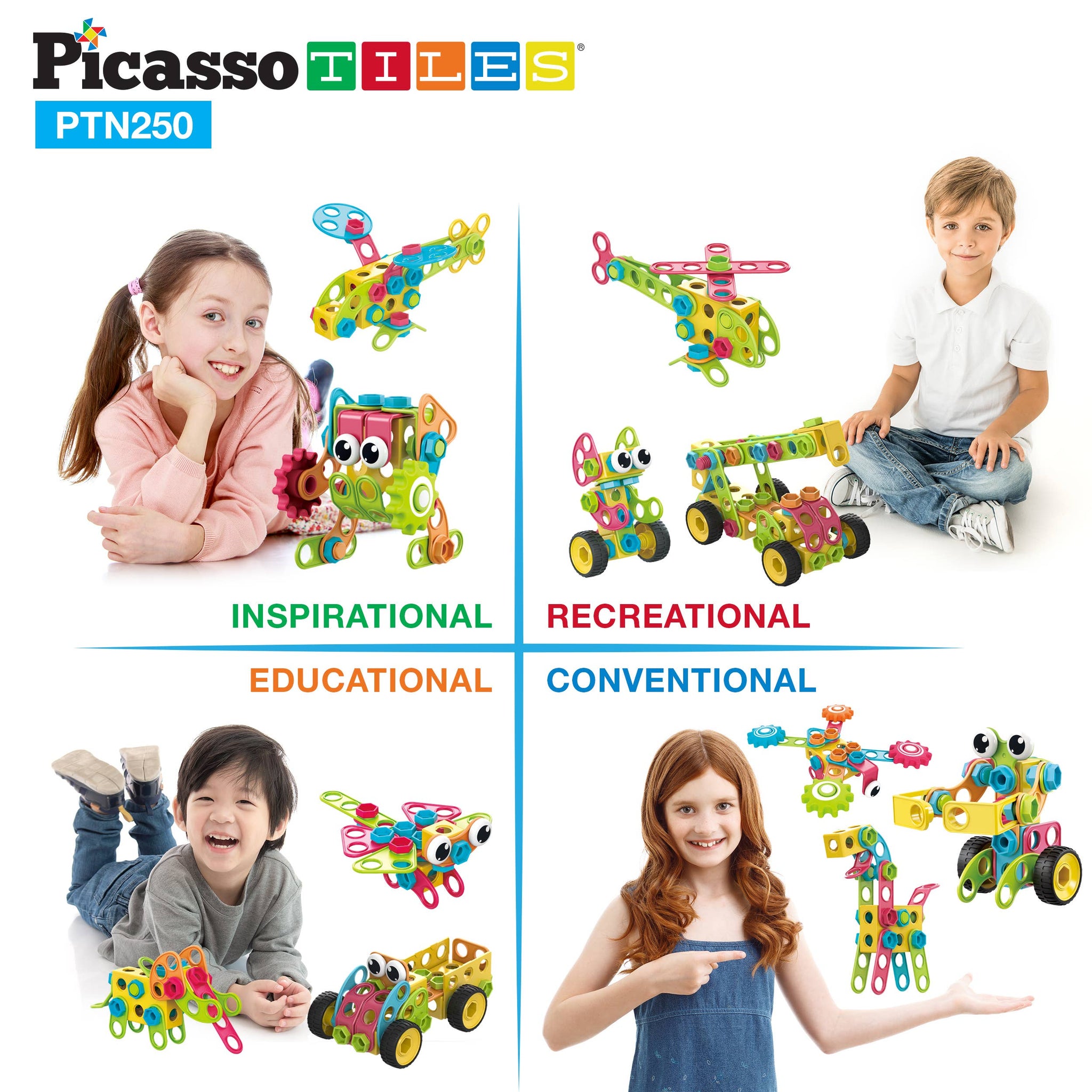 FREE IDEA BOOK & POWER DRILL - This PicassoTiles engineering kit comes with an idea book to enable children to construct over 50 building designs including 16 exploded step-by-step instructions. Be an engineer, architect, or designer, this construction set offers open-ended possibilities to nurture STEM skills, children creativity, intelligence, promote problem-solving abilities, logical thinking, improve hand-eye coordination, gain a strong sense of geometrical shapes and stay focused by playing. DREAM BIG & BUILD BIG! Featuring electric power drill (batteries required and not included) wheels, anchors, screw bolt, wrenches, and clickable mechanic ratchet! Creative Building STEM toy kit playset is entertaining for toddler pretend play, preschool-age child, boy and girl ages 3+. In The Box: - FREE IDEABOOK with 50+ full-color instructional guides including 16 Step-by-step exploded view instructions - 250 Colorful Pieces Including Gears, Blocks, Screws, Wheels, Screwdriver, and more!