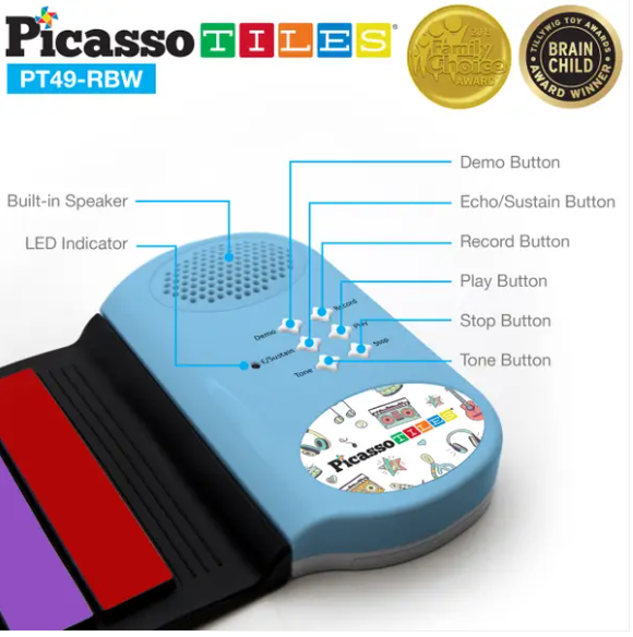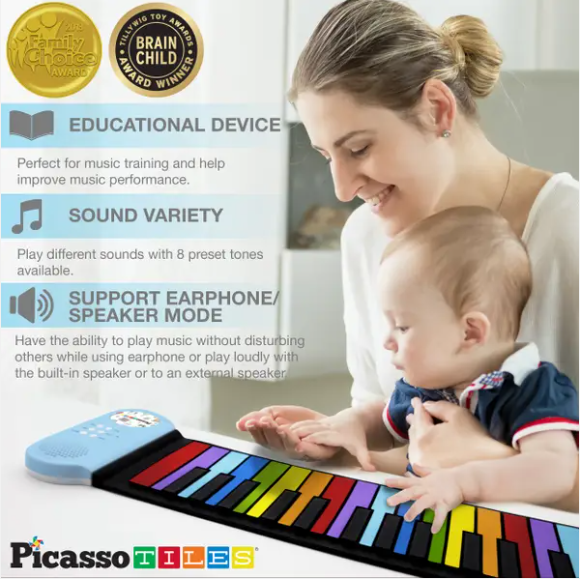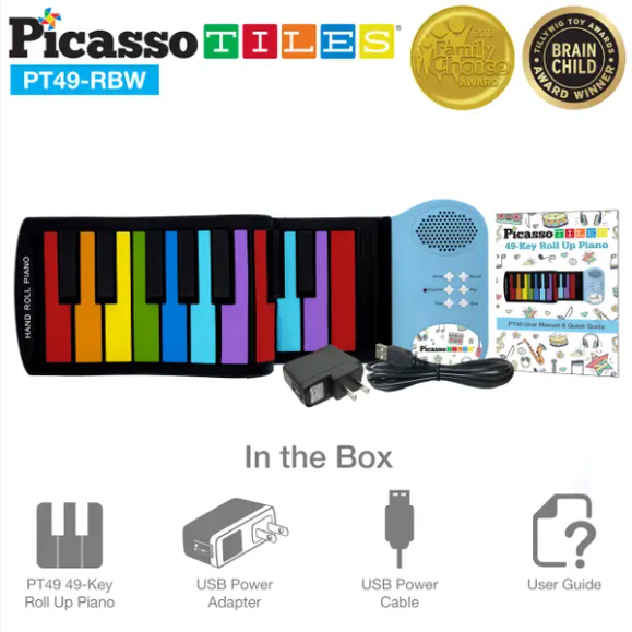 A standard 49 key keyboard made of silicone rubber with soft, comfortable surface and a high sensitivity. 8 different tones: Grand piano, orchestral harp, church organ, tubular bell, electric guitar (jazz), violin, string ensemble 1 and acoustic guitar (steel) and 6 demo songs.