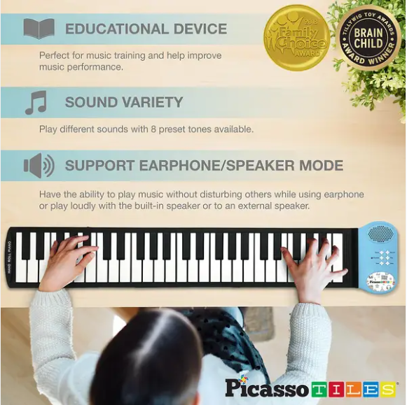 A standard 49 key keyboard made of silicone rubber with soft, comfortable surface and a high sensitivity. 8 different tones: Grand piano, orchestral harp, church organ, tubular bell, electric guitar (jazz), violin, string ensemble 1 and acoustic guitar (steel) and 6 demo songs.