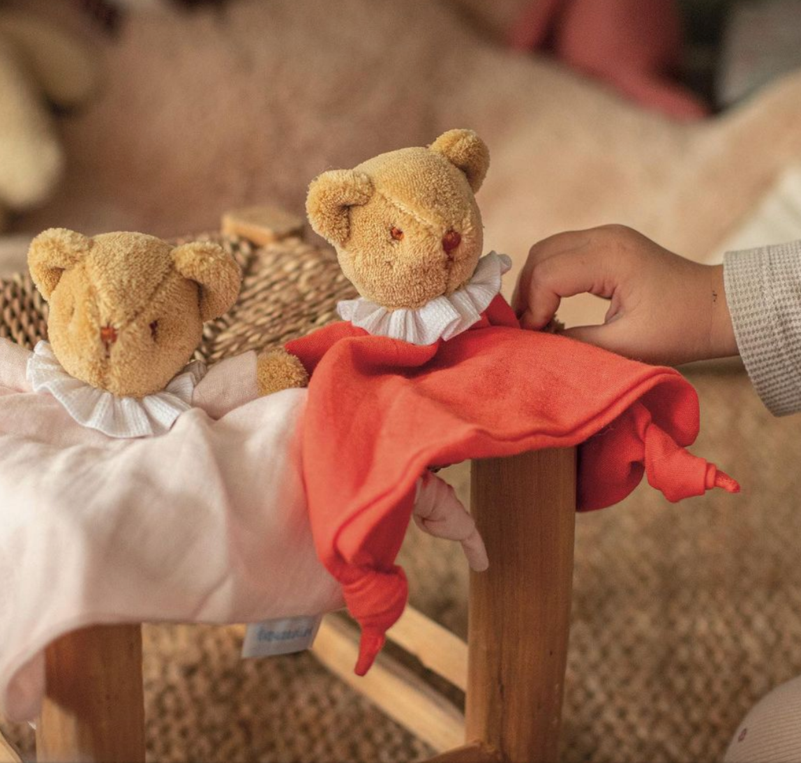 MY FIRST SOFT TEDDY: 20 cm organic cotton triangle-shaped soft toy. Your baby won't be able to do without it, he will take it everywhere with him.