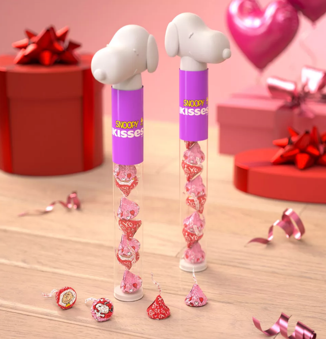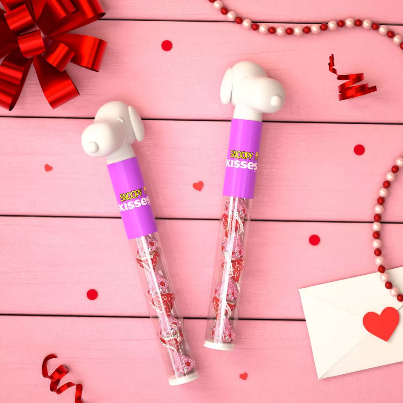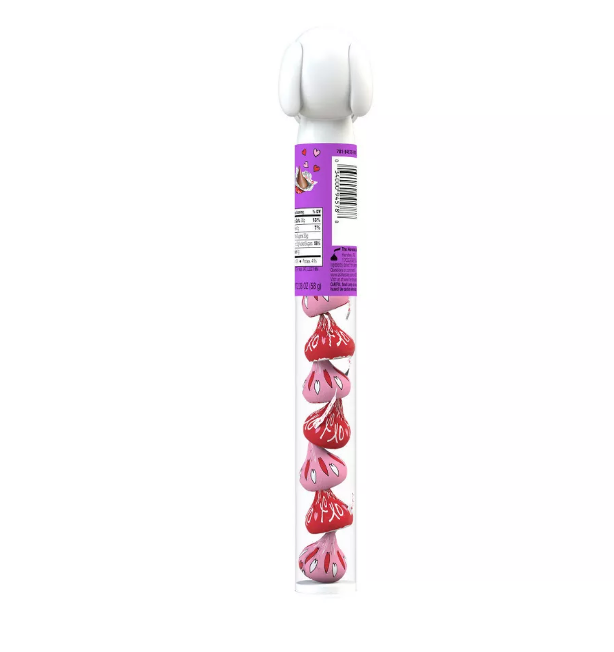 This HERSHEY'S KISSES milk chocolate candy featuring Snoopy™ and friends is the delicious treat you've always loved wrapped in fun Valentine's Day foils inside a plastic cane ready for gifting. Enjoy the taste of smooth, creamy bite size milk chocolate pieces anywhere and at any time. Filled with HERSHEY'S KISSES Valentine's Day candy dressed for the holiday in pink and red foils featuring Snoopy and friends, this plastic cane of chocolates is the perfect gift for loved ones for a special way to show and celebrate your love. Share these individually wrapped treats with friends and family members or bring a plastic cane with you to your next movie night or celebration. These milk chocolate candies are perfect for adding to lunch boxes or bringing to share with the entire class. Stock your candy dishes, fill your snack cabinet, take some to the office, or decorate for Valentine's Day with adorable pink and red foil wrapped candies suited for any celebration. Spend a day baking with the whole family and spruce up your recipes by adding HERSHEY'S KISSES candy on top of cookies, brownies, cupcakes and more — no matter how you choose to share them, these creamy milk chocolate treats will make the day sweet for everyone involved.
