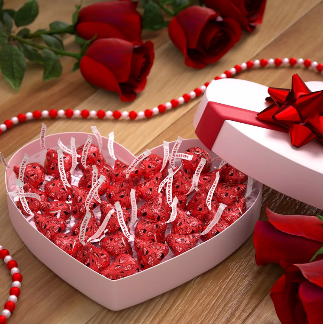 This HERSHEY'S KISSES chocolate dipped strawberry flavored candy is the delicious chocolate treat you've always loved wrapped in fun Valentine's Day foils and packaged in a festive bag. Enjoy the decadent taste of extra creamy milk chocolate candy with a strawberry flavored center any time, anywhere. These HERSHEY'S KISSES candies are individually wrapped in red foils with strawberry illustrations for an adorable gifting experience for everyone you love. Share these individually wrapped treats with friends and family members or bring a bag with you to your next movie night or celebration. This bag of chocolate Valentine's Day candy is full of individually wrapped pieces, so you can gift the whole bag or hand HERSHEY'S KISSES treats out separately to everyone on your list. Stock your candy dishes, fill your snack cabinet, take a bag to the office, or decorate for Valentine's Day with colorful red foil-wrapped candies with adorable illustrations suited for any celebration. Spruce up your baked goods by adding HERSHEY'S KISSES candy on top of cookies, brownies, cupcakes and more — no matter how you use them, these creamy milk chocolate treats will make the day sweet for everyone involved. Just don't forget to save a few candies for yourself during all that sharing.