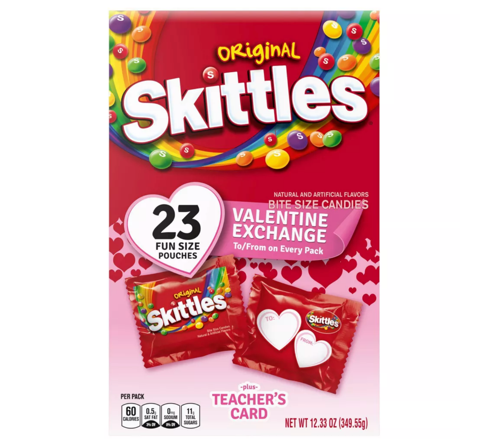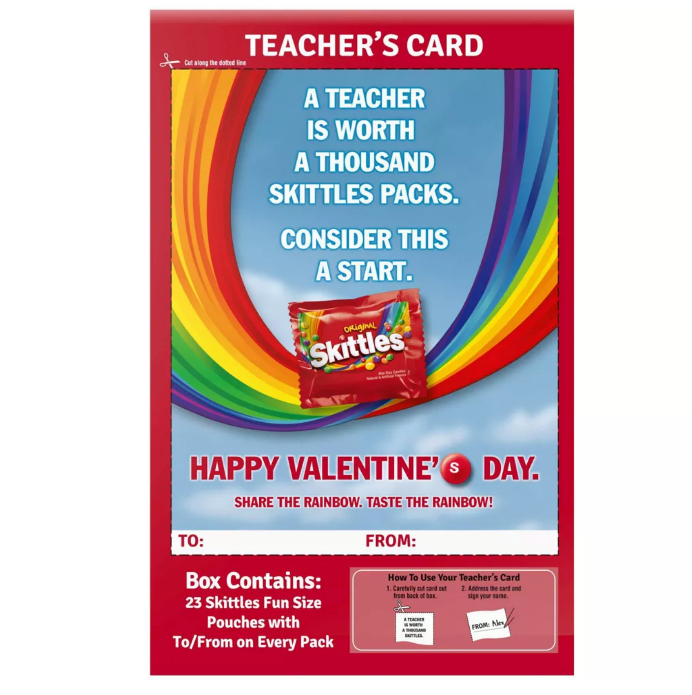 Choosing this box of SKITTLES Originals not only treats your taste buds but also offers you a break. How? Each fun-size pack comes with "To/From" already printed, making personalizing your SKITTLES pack as easy as giving them away to your special loved ones. And don't miss the chance to show appreciation to a favorite teacher with the special Teacher’s card on the back of every SKITTLES ORIGINALS Valentine's Day Exchange box.