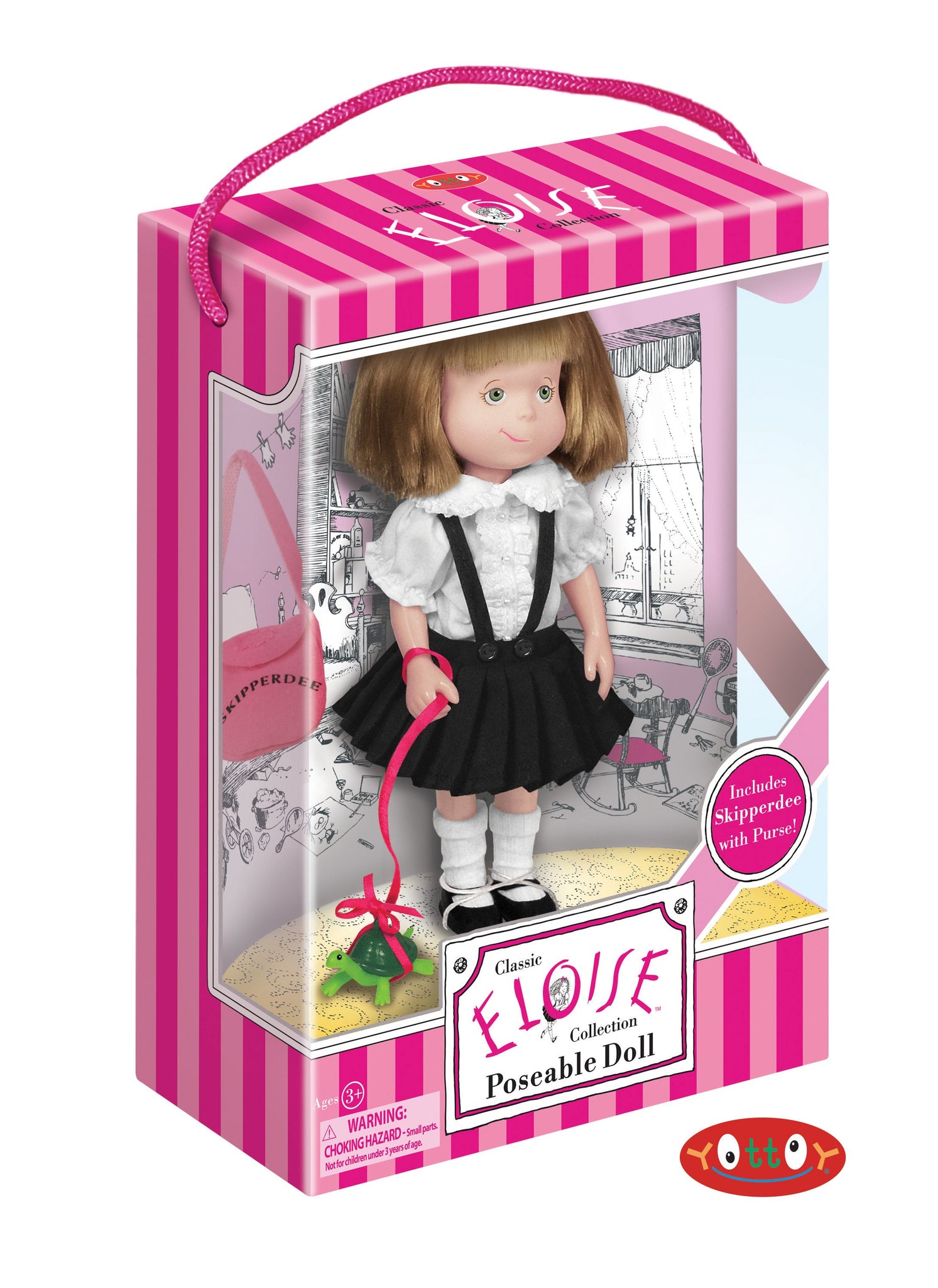 It’s easy to be drawn to this fanciful doll with movable head and limbs made of smooth vinyl, and “soooo” many details derived from the famous pink-splashed black and white illustrations of Eloise. Eloise stands tall, dressed in a white ruffled blouse accented with pearlescent buttons, black pleated skirt with buttoned suspenders, pink bloomers, soft knit socks, and black patent shoes. Eloise’s bright pink ribbon hair bow and mischievous expression are a perfect match to her cheeky personality. She is accompanied by Skipperdee on a satin leash and an over-the-shoulder purse to carry her pet turtle on endless adventures! The detailed drawing of Eloise’s hotel bedroom is printed as the backdrop in her take-along package for you and Eloise to embark on a day of pretending that you absolutely “cawn’t” resist!