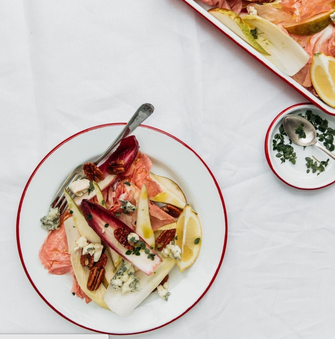 Four enamel plates with coloured rims. Perfect for dinner parties or camping trips.