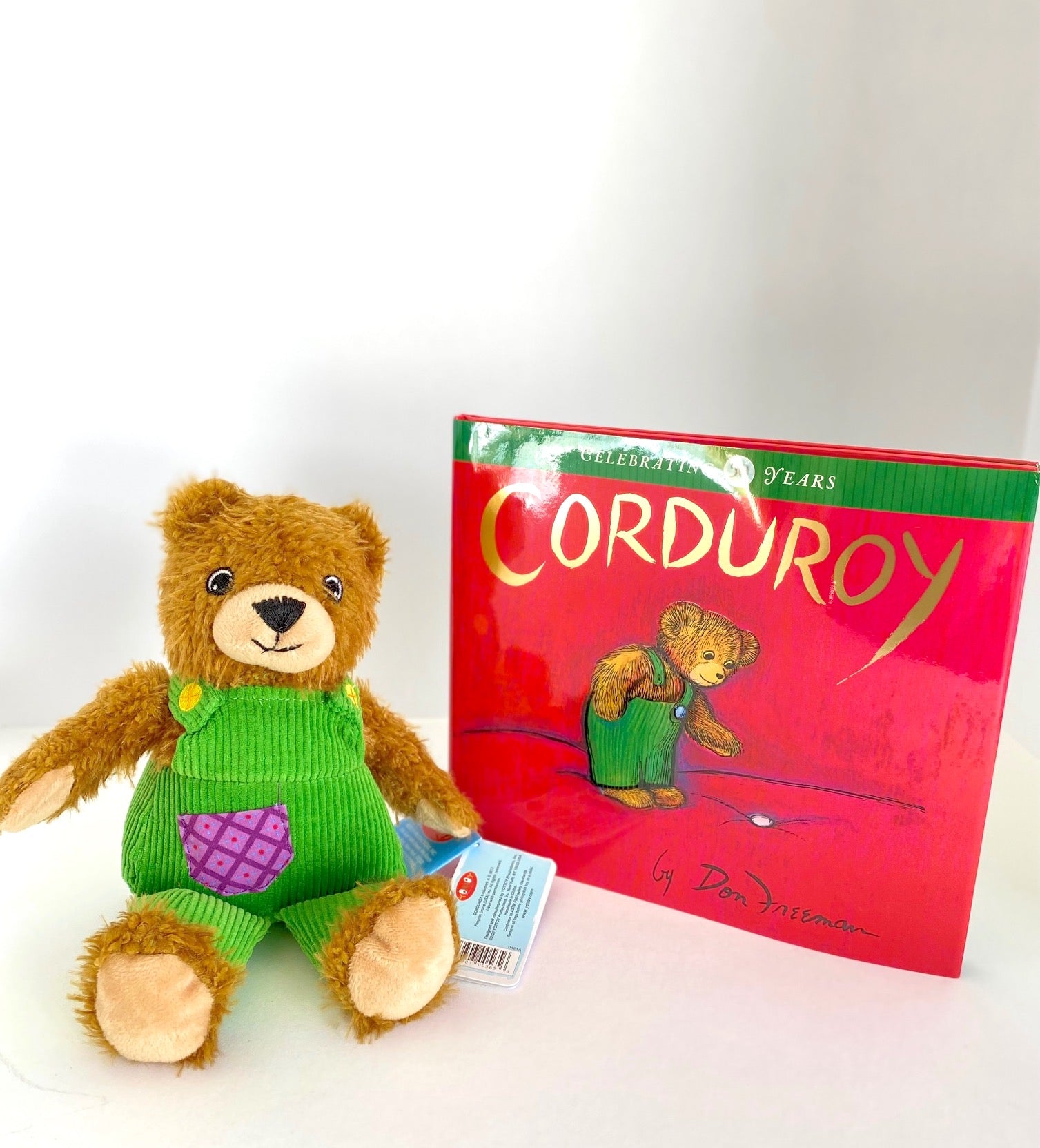 Inspired by Don Freeman's Corduroy books, this cuddly Corduroy has the softest plush fur and lots of the different textures that infants find irresistible. Young ones will love to hold this sweet bear dressed in his signature green corduroy overalls with a purple patch pocket. Corduroy features hand-embroidered details, making him especially perfect for little ones!